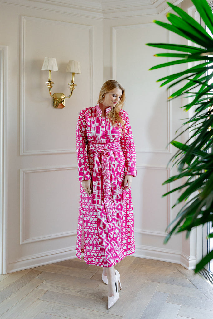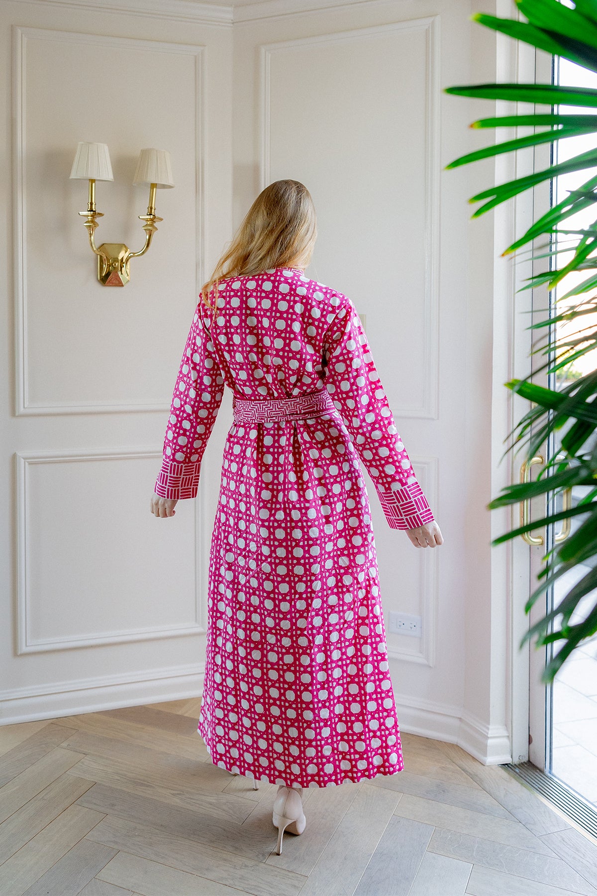 Our classic Caning © 2023 Prints in hand-dyed vibrant fuchsia is our newest bold color to love! All of our prints are hand-drawn in house, translated onto wood blocks, and hand-printed one by one.