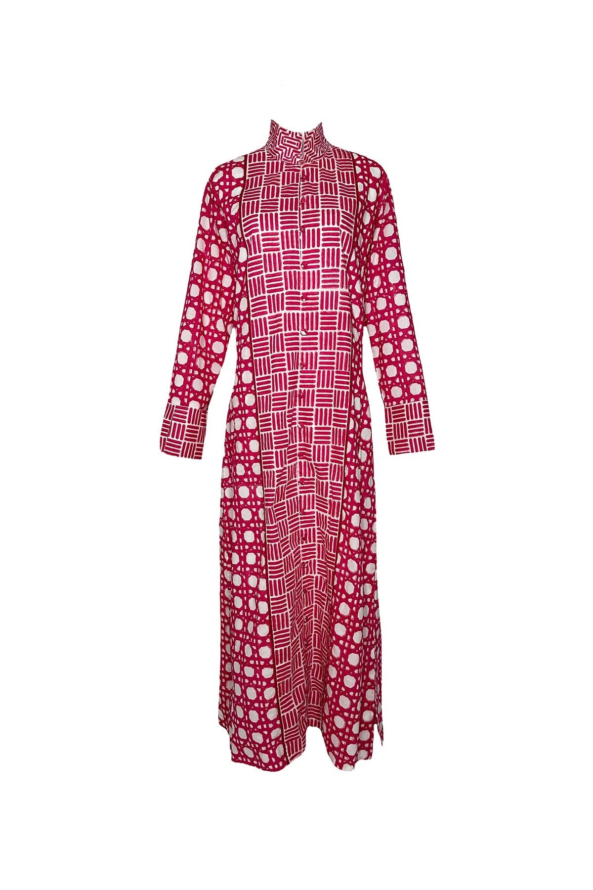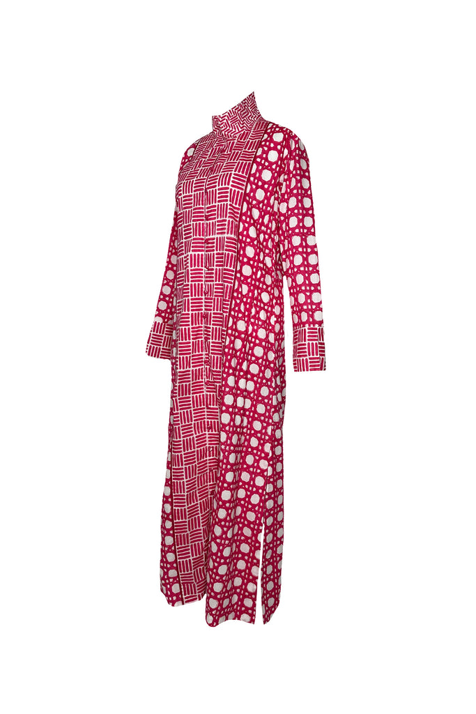 Our Marrakech banded-collar Kaftan exemplifies effortless glamour. It is designed and sewn in house with 100% cotton hand-dyed custom block print. We adore this Marrakech Kaftan dress style with its long, flattering lines and flowing side slits. The elongated button-front placket makes this a versatile piece, wearing it open or closed. From Palm Beach to Palm Springs… South Beach to the South of France… this beauty has you covered.