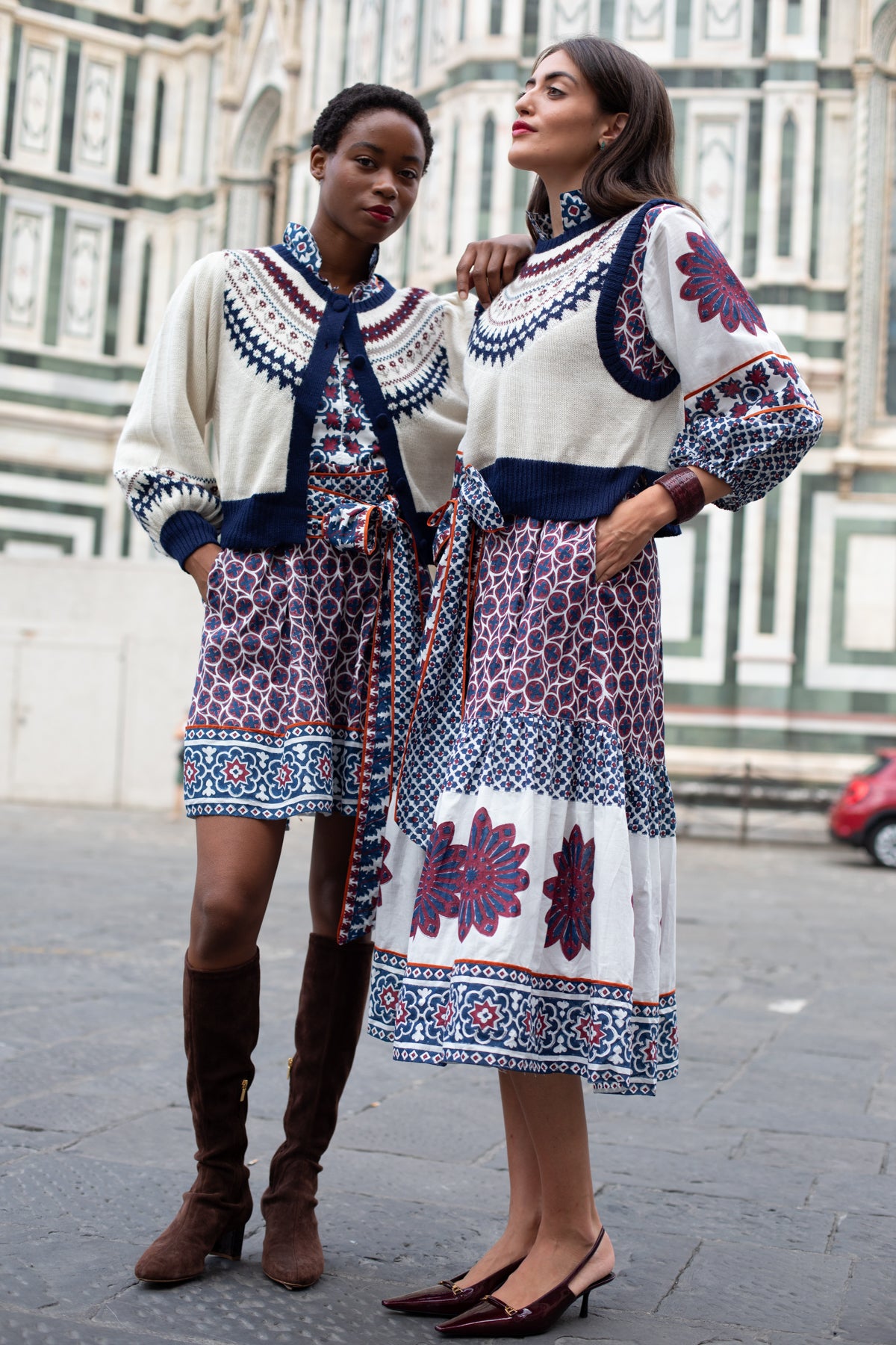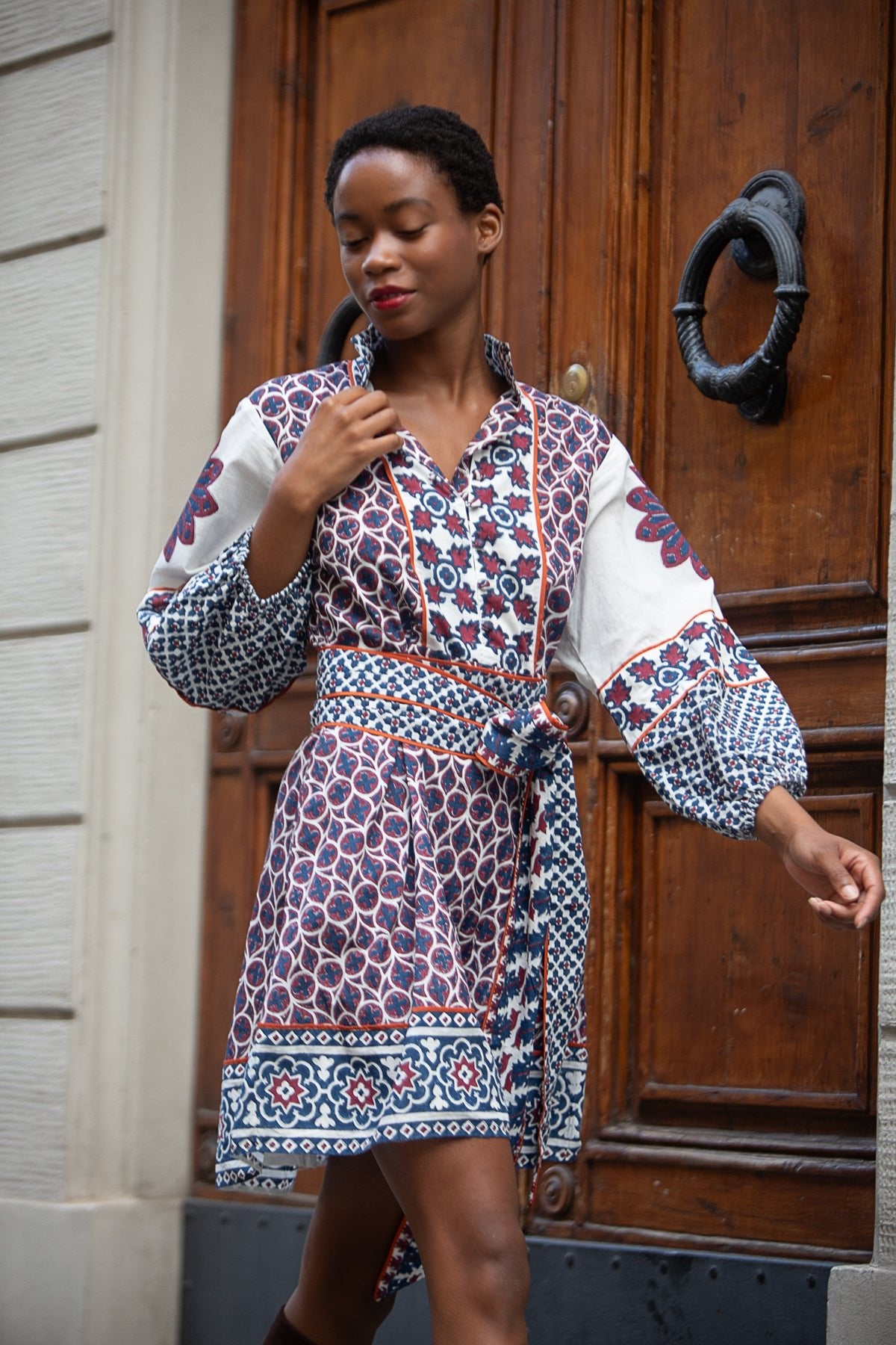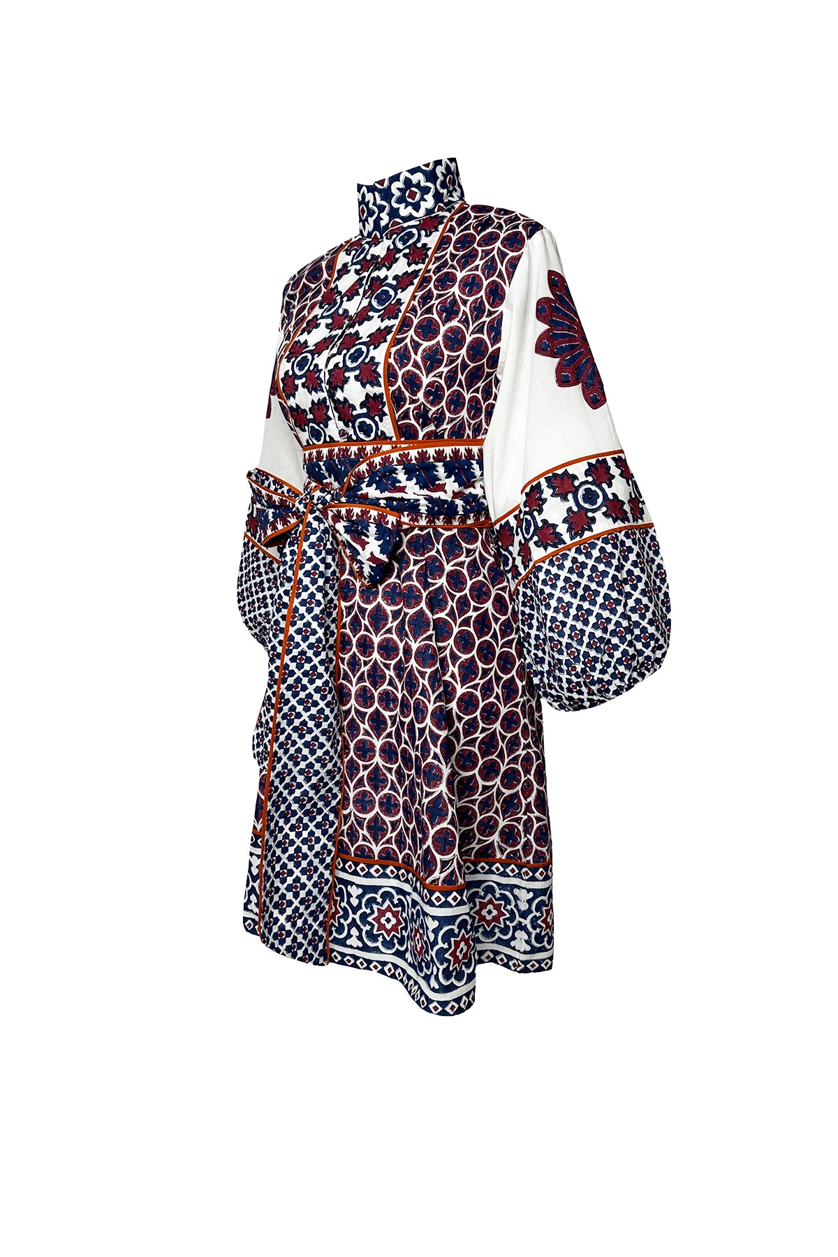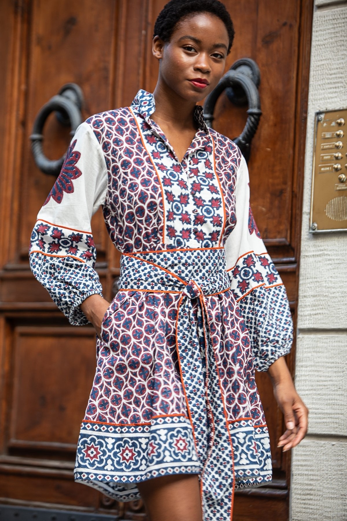 Our best selling SUE SARTOR Flounce™ Shorty dress is back in a warm, autumnal color palette — perfectly fall forward in every way. Our hand-illustrated Piazza © 2025 Print Series weaves together acanthus leaves and timeless quatrefoil patterns in rich burgundy and deep navy, accented with a meticulously hand-piped terracotta tone. Wear it with boots and layer with our cozy heirloom knit capsule for the quintessential autumn look.Crafted in breathable 100% cotton and made in small batches, each garment is created with thoughtful details: a button-front placket, face-framing banded collar, side-seam pockets, tiered skirt, and contrast hand-piping.