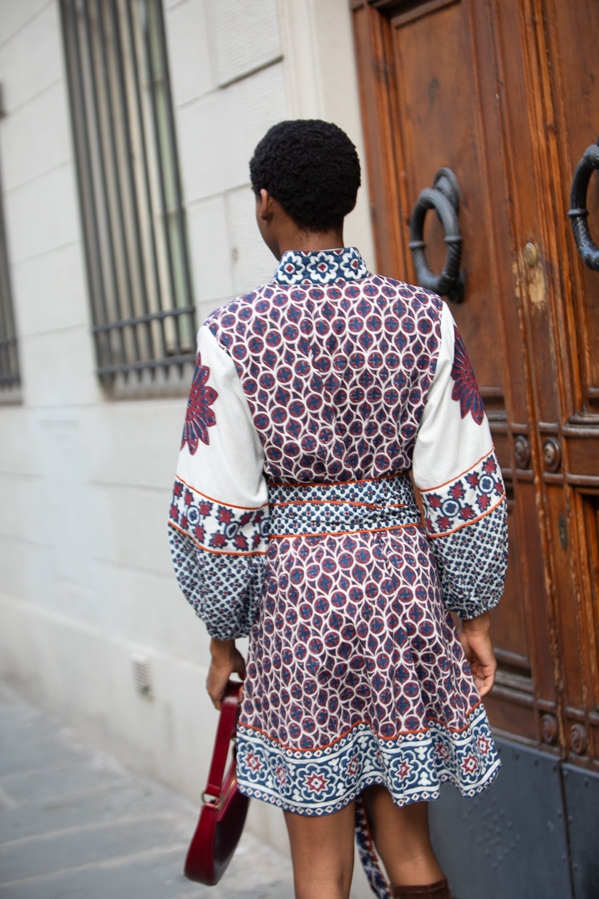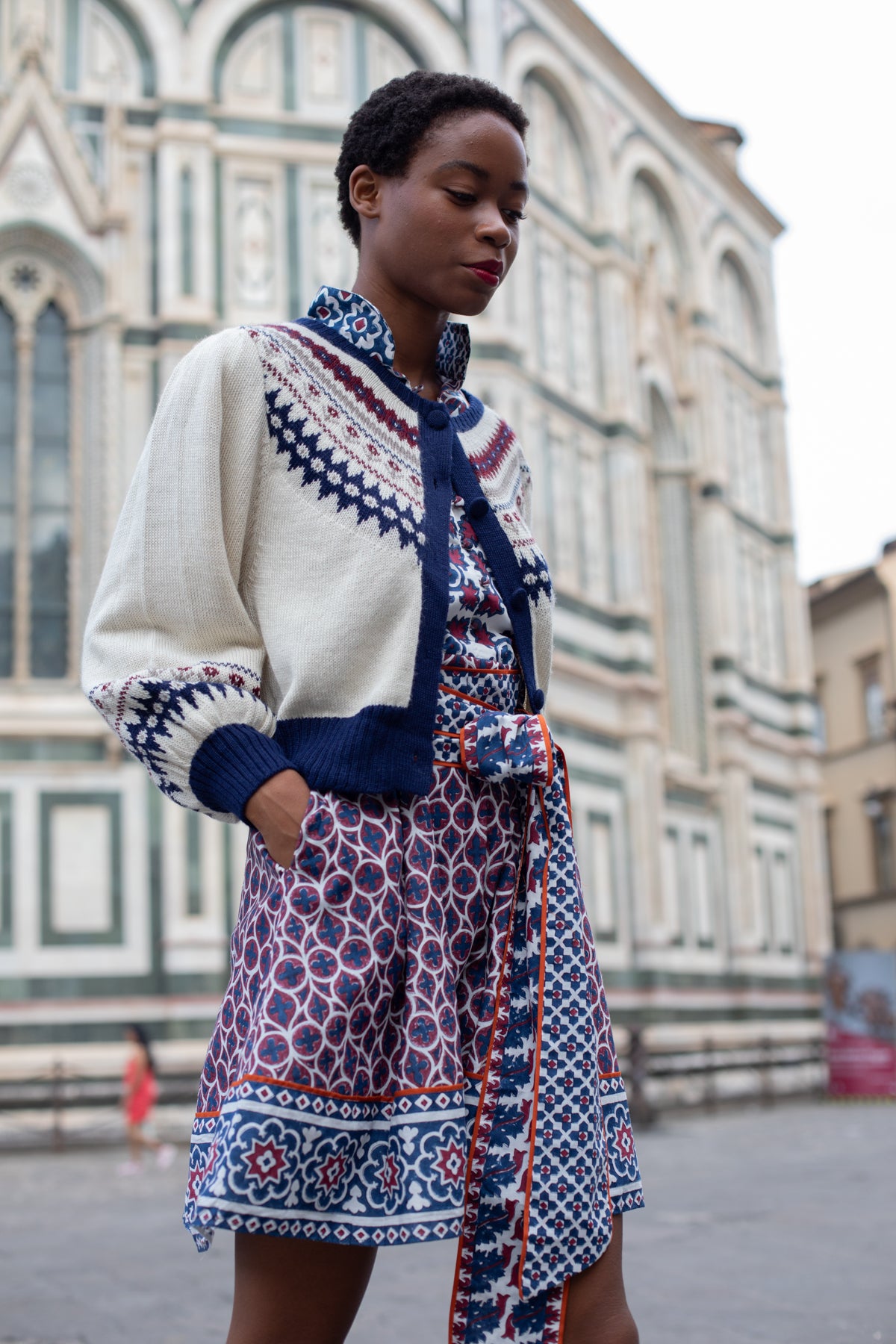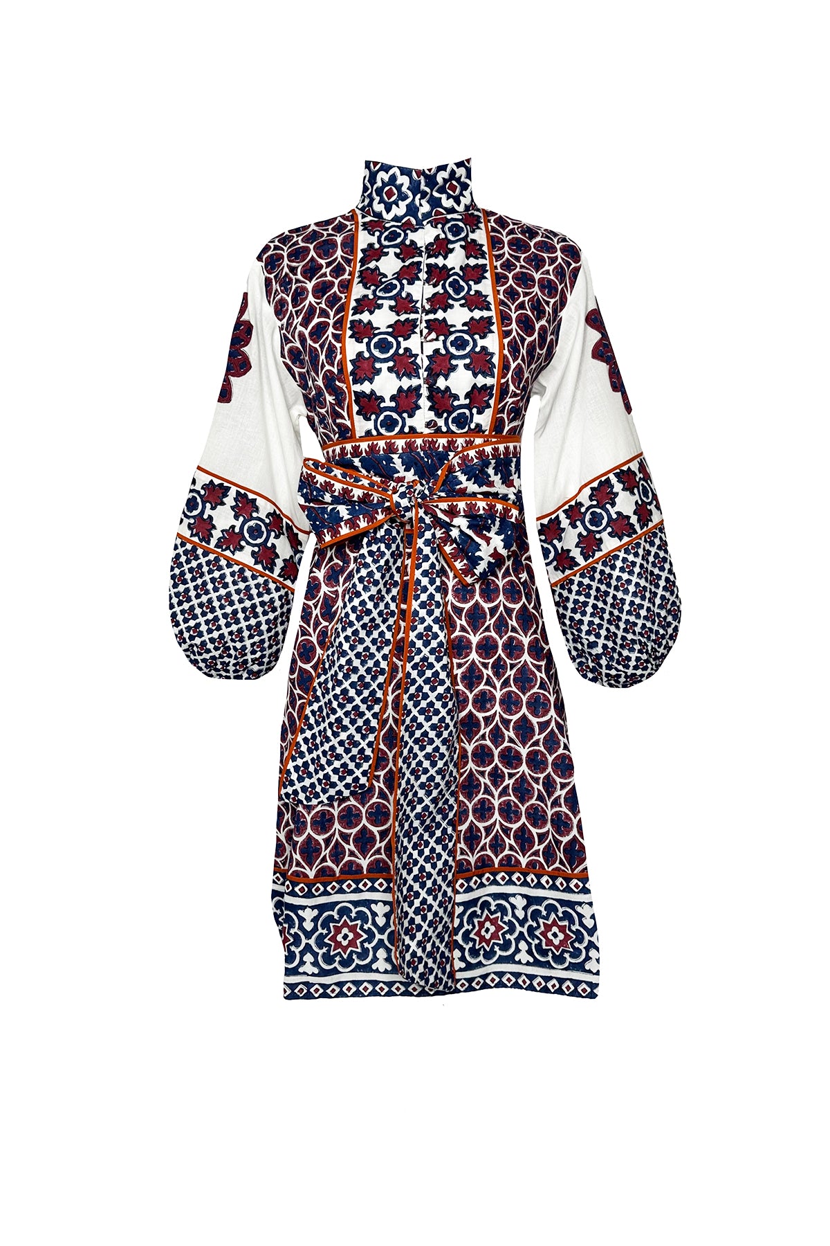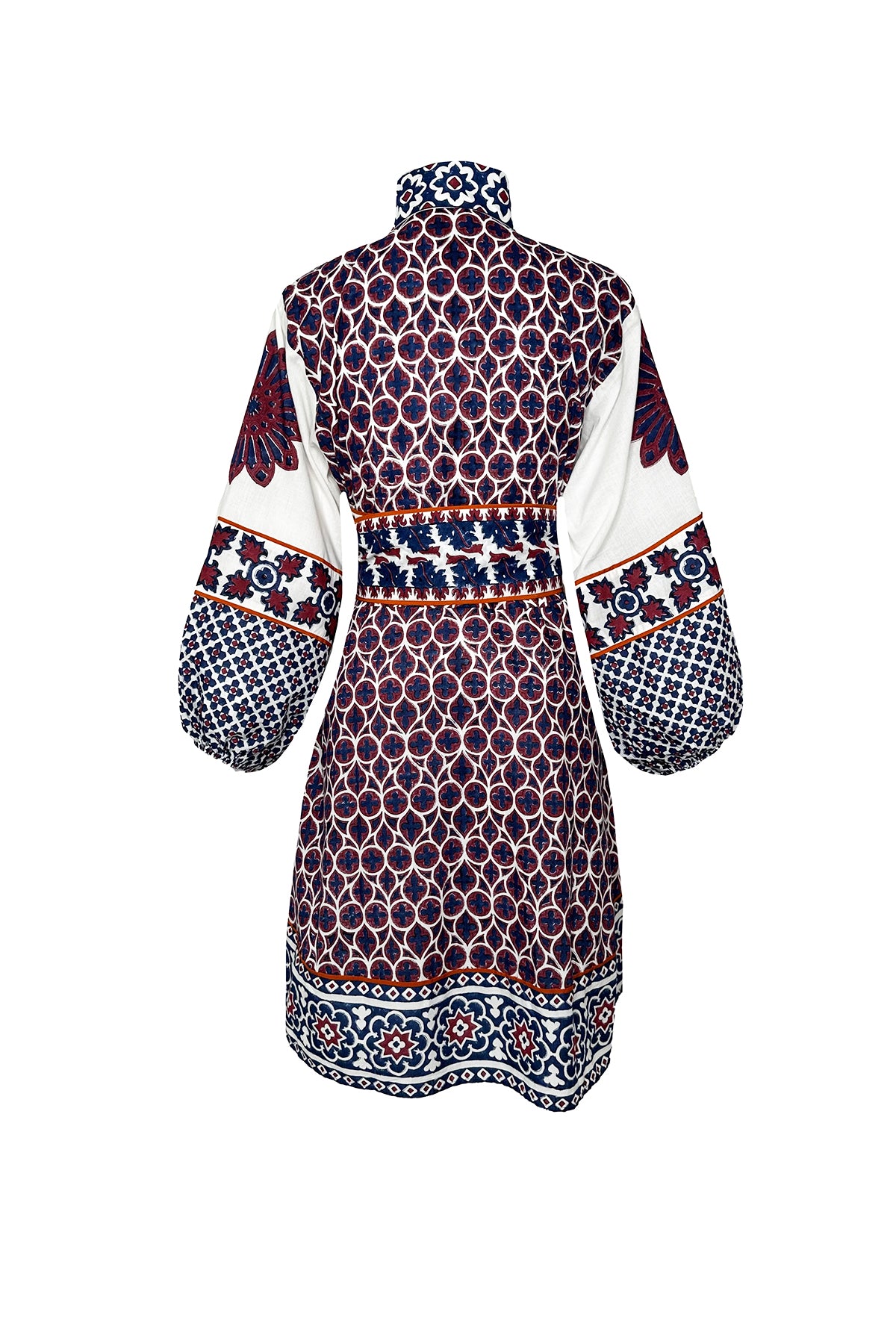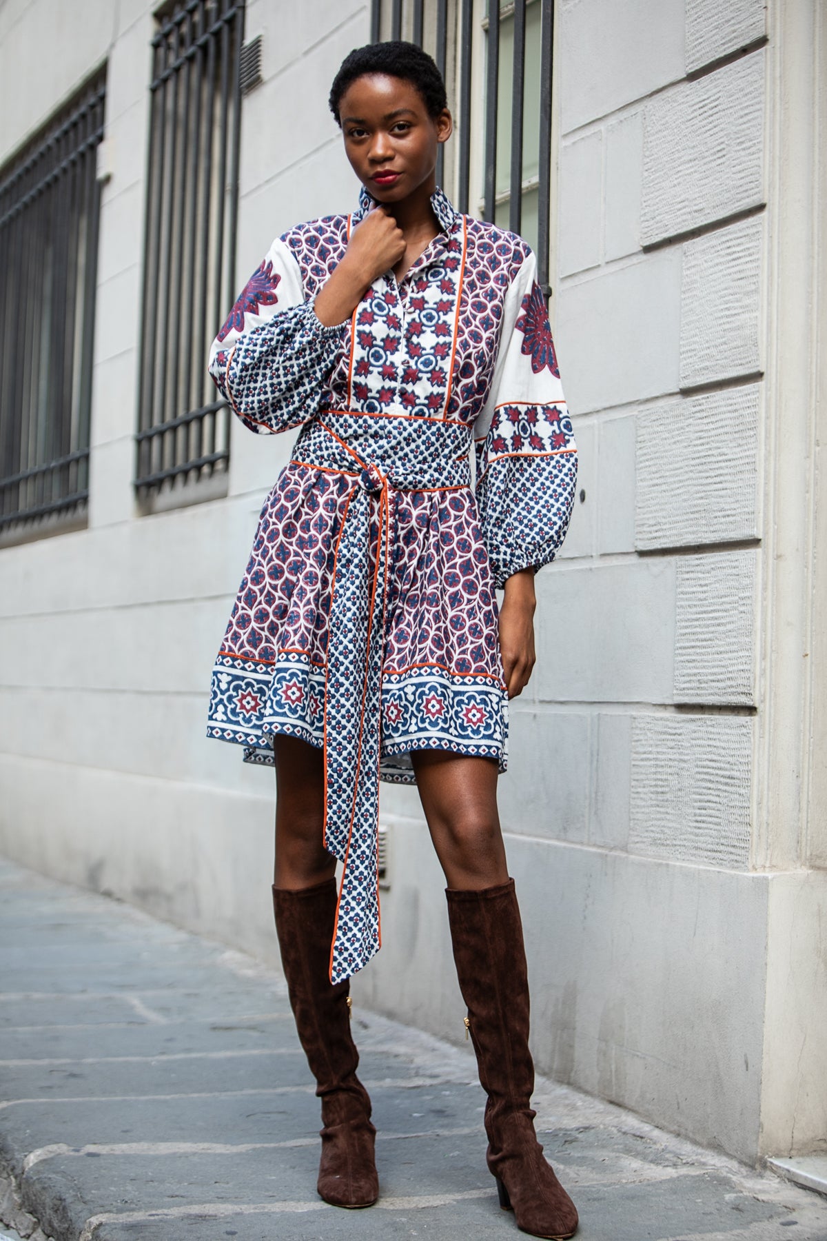 Our best selling SUE SARTOR Flounce™ Shorty dress is back in a warm, autumnal color palette — perfectly fall forward in every way. Our hand-illustrated Piazza © 2025 Print Series weaves together acanthus leaves and timeless quatrefoil patterns in rich burgundy and deep navy, accented with a meticulously hand-piped terracotta tone. Wear it with boots and layer with our cozy heirloom knit capsule for the quintessential autumn look.Crafted in breathable 100% cotton and made in small batches, each garment is created with thoughtful details: a button-front placket, face-framing banded collar, side-seam pockets, tiered skirt, and contrast hand-piping.