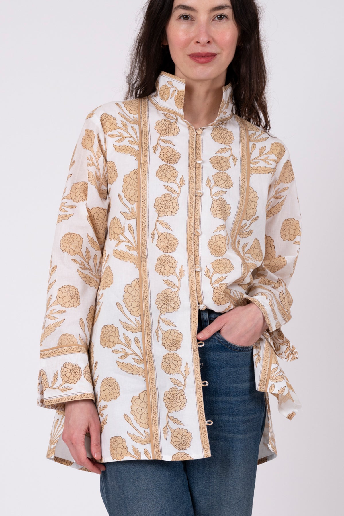 An instant classic and true wardrobe cornerstone, Chino SUE SARTOR Marigold is the essential neutral.Timeless, versatile, and endlessly wearable, this beloved floral has become a SUE SARTOR signature. Hand-illustrated and artisan block-printed, it offers soft sophistication that pairs beautifully with everything in your wardrobe. Thoughtfully designed in our Marrakech Tunic that is sure to be your day-to-day go-to. Style it loose, tucked, or half-tucked for a look that’s relaxed yet refined. Effortlessly chic and beautifully proportioned, it transitions seamlessly from everyday dressing to spring escapes.