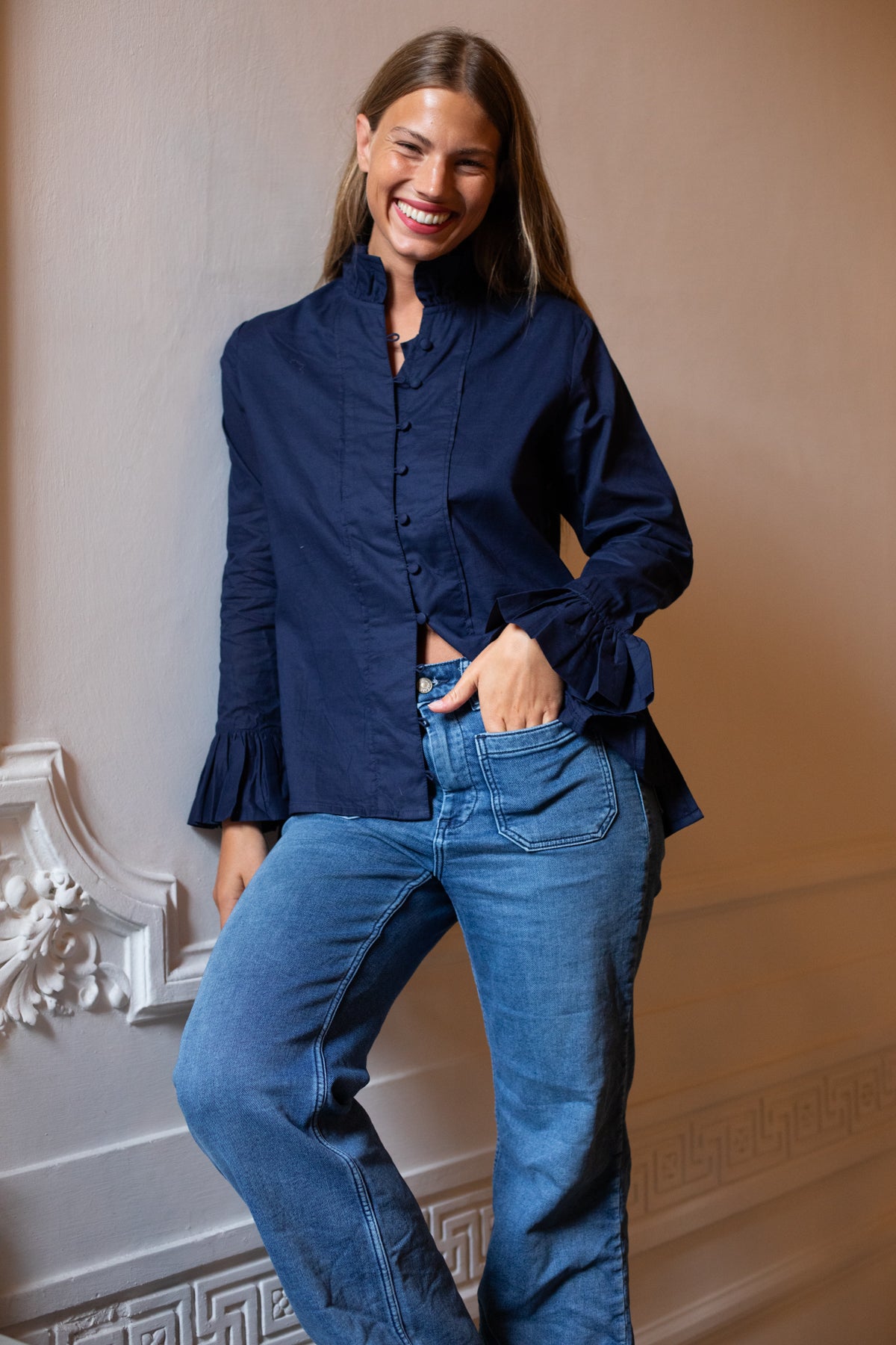 Our Montalcino Tunics are made to layer beautifully under our Heritage Knitwear Collection, and to be styled endlessly with flair, femininity, and ease. The impeccably tailored pleated ruffle collar and sleeve add just the right touch of detail and movement. Choose crisp white or our tried-and-true navy. Crafted from 100% premium cotton that wears like a dream. Note the front hem is slightly higher than the back, allowing for additional coverage, styling options, and the perfect front tuck!