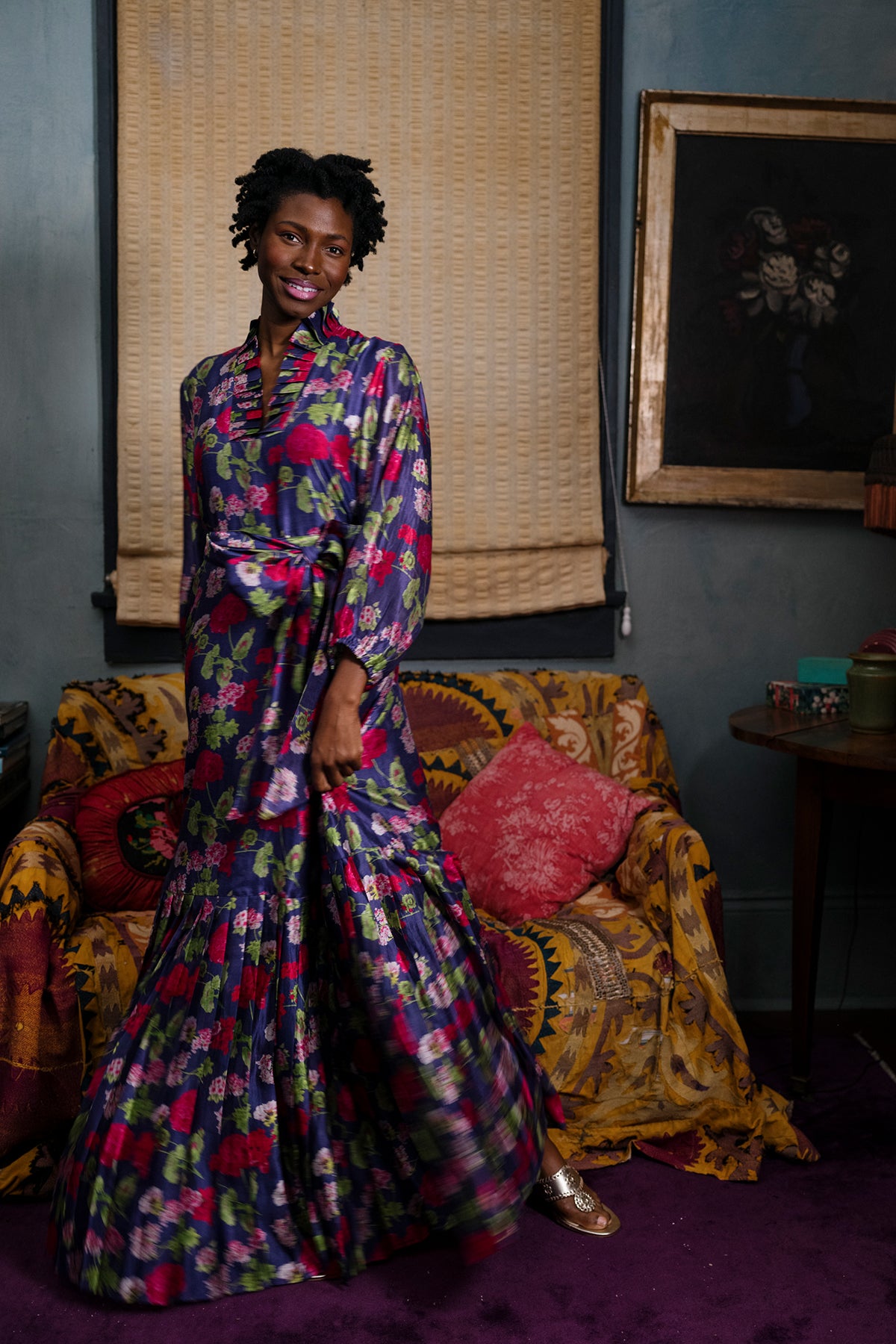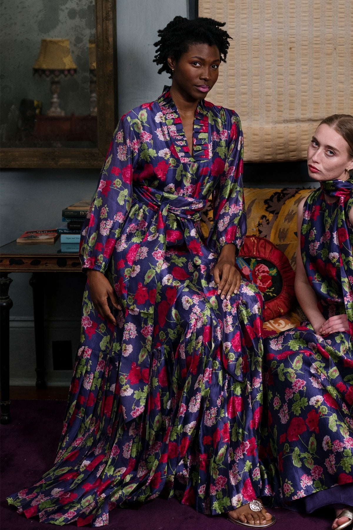 Our Geranium Print in 100% tissue-weight silk is nothing short of radiant. A crescendo of purples, pinks, and verdant greens on airy silk moves like light itself. Joyful yet refined, it’s perfectly suited for spring celebrations of every kind. This is our version of elevated dopamine dressing in floral form. This elegant Pleated SUE SARTOR Flounce Gown is the perfect wardrobe staple for special occasions. This gown is 60" inches in length, allowing for the perfect sweeping formal dress. Order yours today for the upcoming seasons, weddings, or whatever fête you have next!