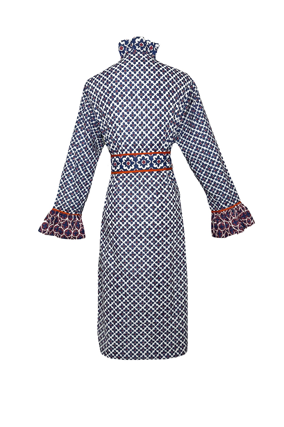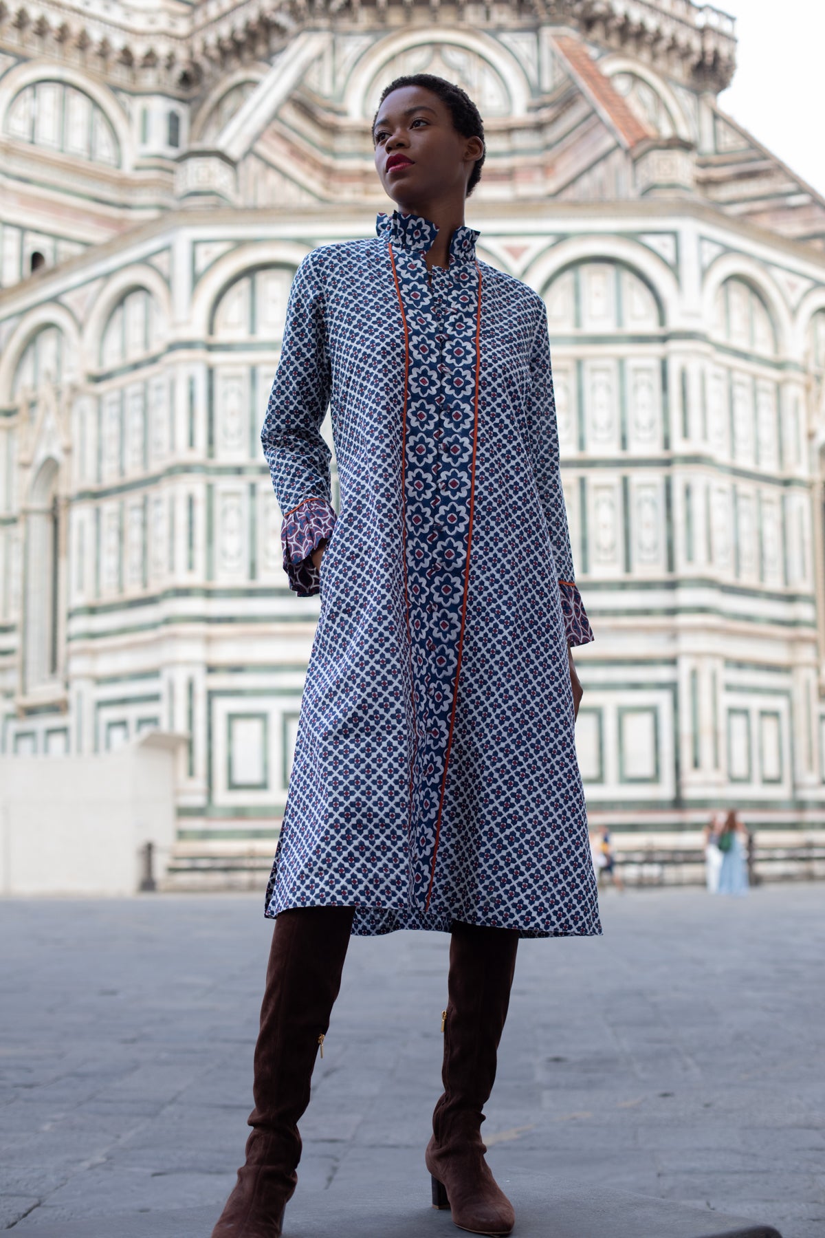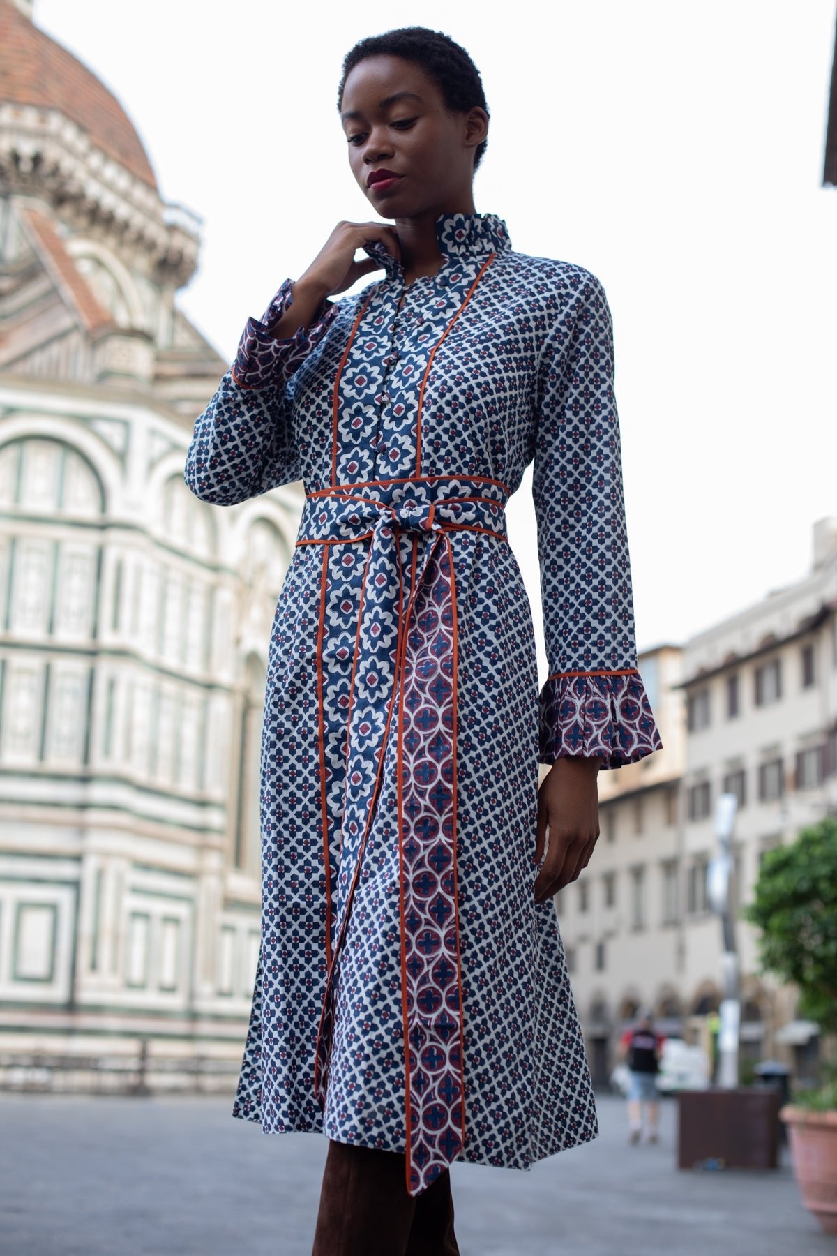 The Montalcino Midi Dress is our answer to the ultimate shift silhouette. Our hand-illustrated Piazza © 2025 Print Series weaves together acanthus leaves and timeless quatrefoil patterns in rich burgundy and deep navy, accented with a meticulously hand-piped terracotta tone. This warm, rich palette is fall forward in every way. Wear it with boots and layer with our cozy heirloom knit capsule for the quintessential autumn look.