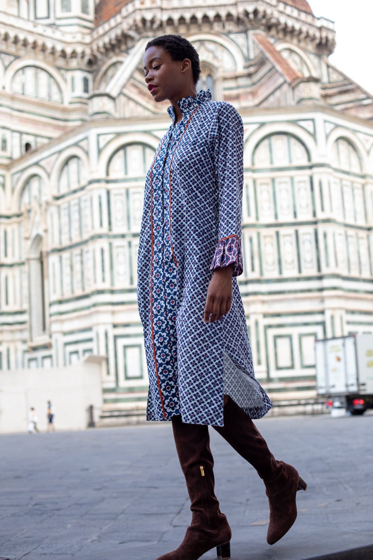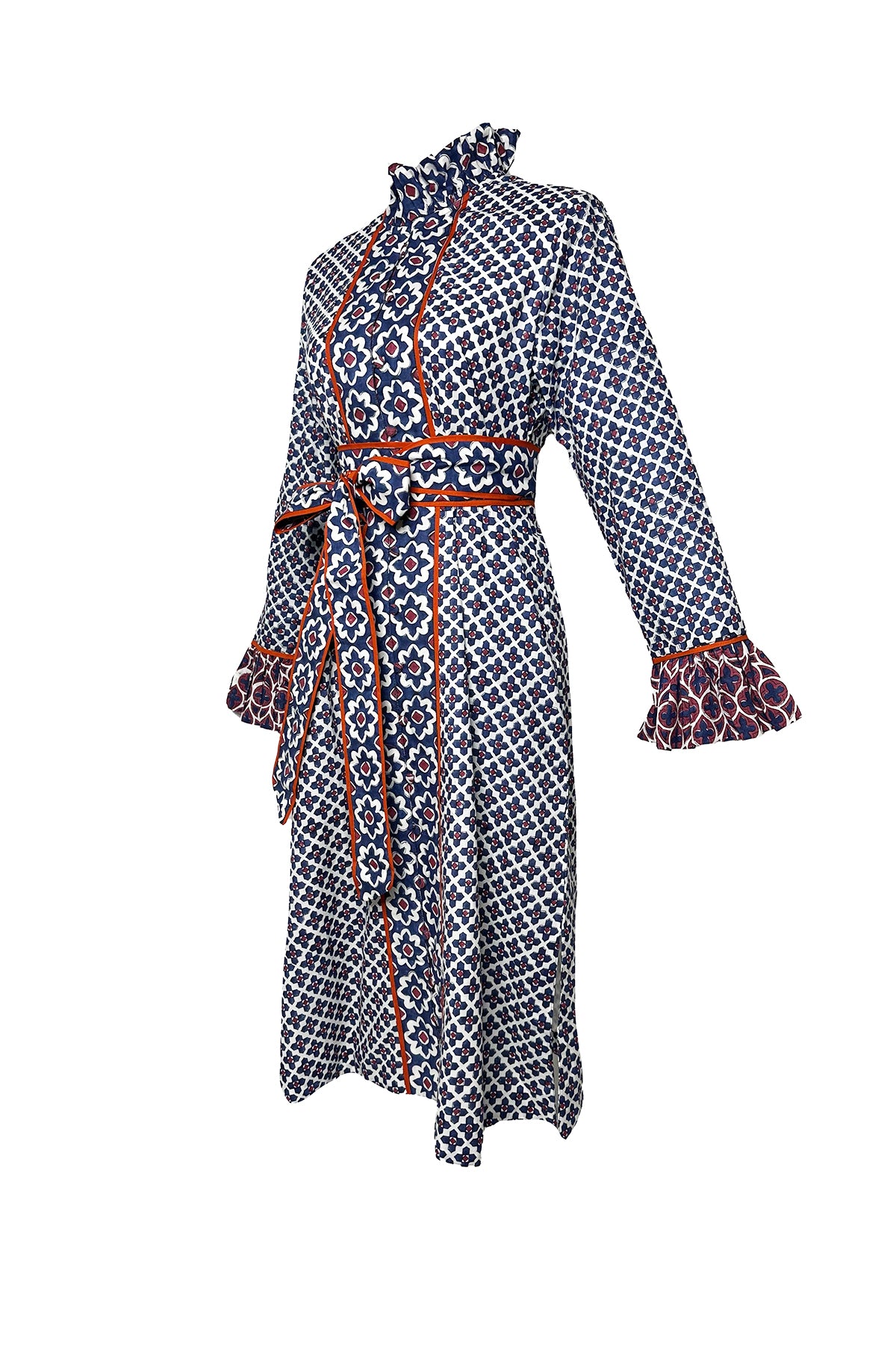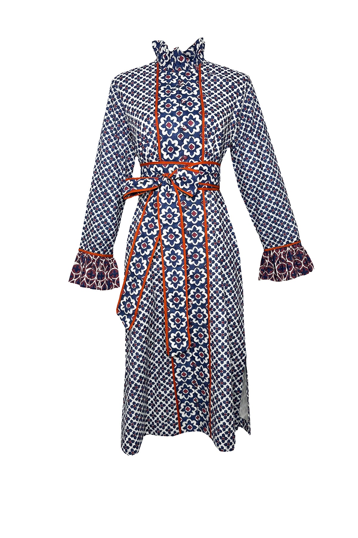 The Montalcino Midi Dress is our answer to the ultimate shift silhouette. Our hand-illustrated Piazza © 2025 Print Series weaves together acanthus leaves and timeless quatrefoil patterns in rich burgundy and deep navy, accented with a meticulously hand-piped terracotta tone. This warm, rich palette is fall forward in every way. Wear it with boots and layer with our cozy heirloom knit capsule for the quintessential autumn look.