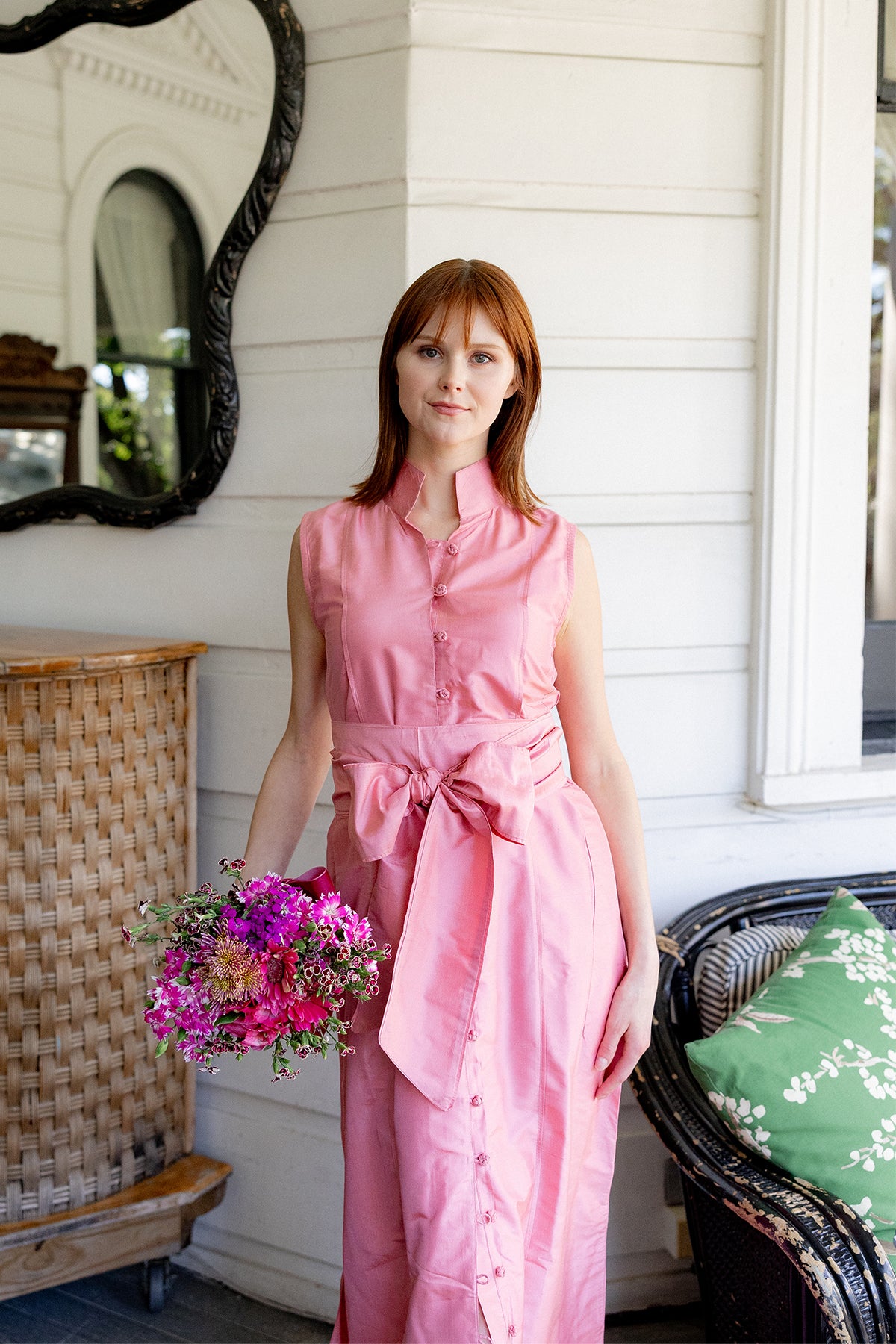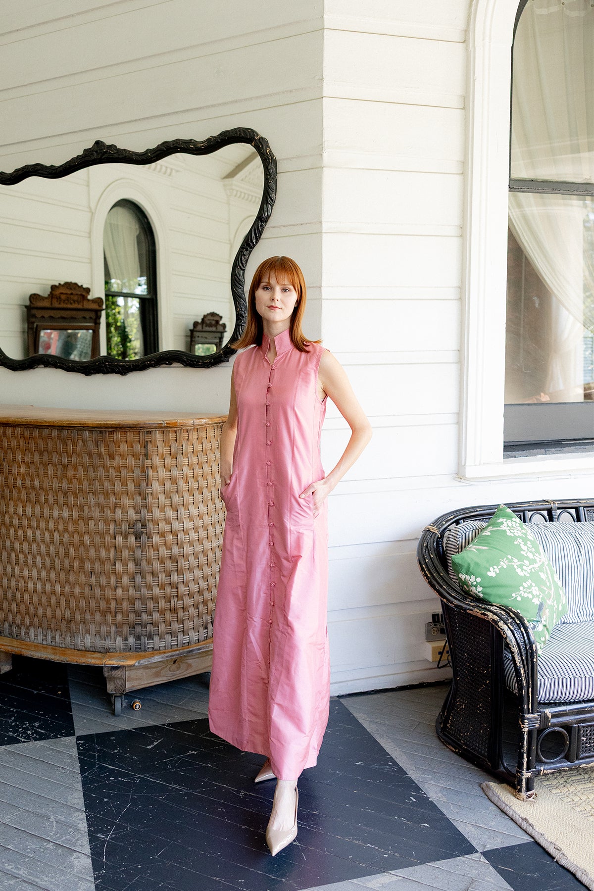 Our beloved long-line Marrakech Kaftan now comes sleeveless - a chic, effortless piece perfect for resort days or layered under a Pashmina for a special event or sweet lady jacket for a luncheon or cocktail party. Crafted from our hand-loomed, hand-dyed soft coral pink taffeta, this piece feels crisp, luxe, and timelessly refined. Featuring hand-rolled buttons up the front, it can be worn fully fastened or unbuttoned to reveal a hint of leg or showcase a favorite shoe. Side slits add graceful movement and versatility.Our signature band collar beautifully frames the face, while the hand-piped finishing highlights the artistry in every detail.