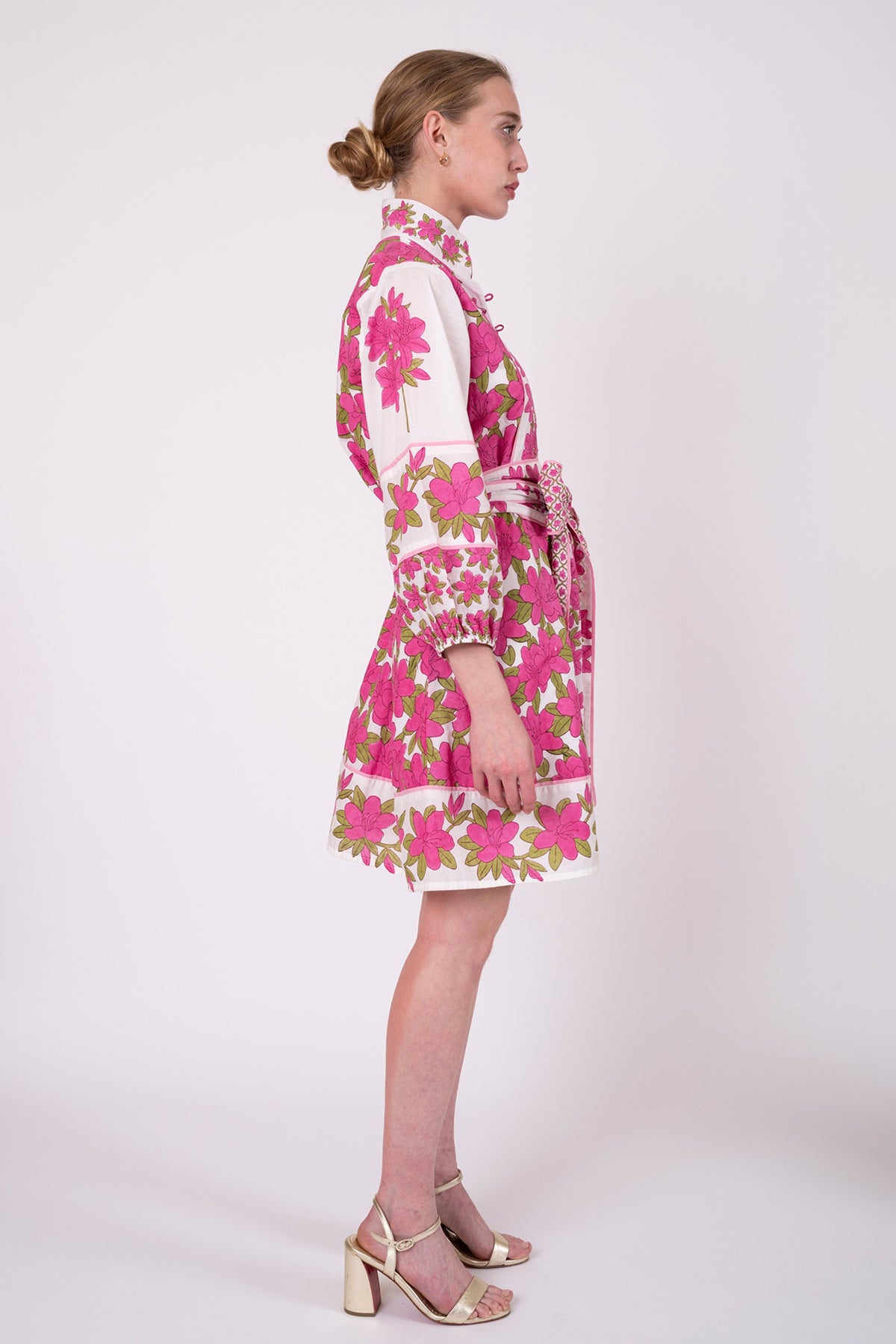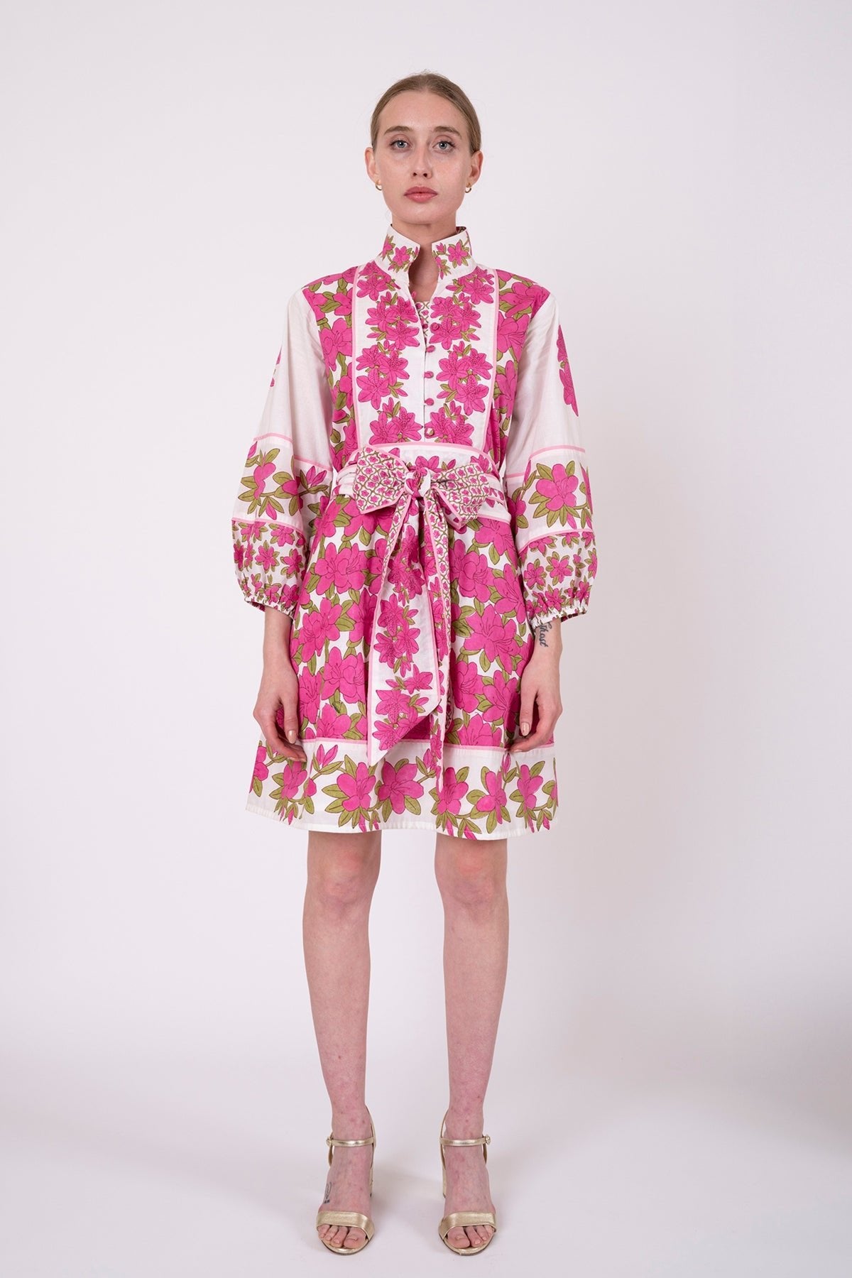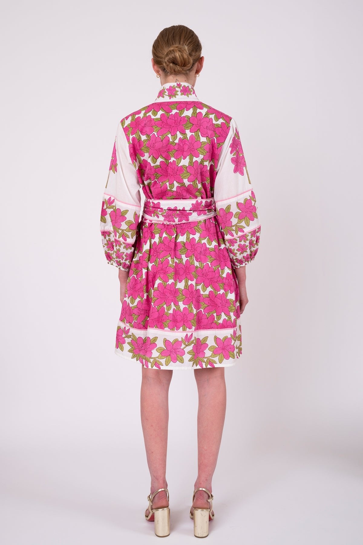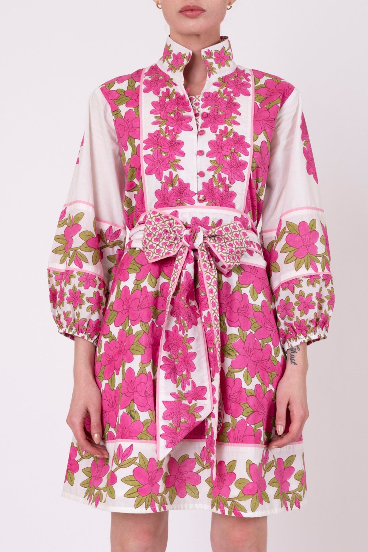 Our Fuchsia Pink Azalea in the classic SUE SARTOR Flounce™ Shorty is unapologetically joyful! It is a radiant celebration of spring in full bloom. Hand-drawn with intention and carved by artisans onto our special teak wood blocks, this vibrant colorway bursts with petal-rich blossoms and a custom-framed border. The styles are layered, feminine, and utterly captivating.This lively pink was designed for Easter brunches, bridal showers, garden soirées, and every special spring gathering that calls for something unforgettable. Designed in our signature SUE SARTOR Flounce™ Shorty with all of the thoughtful details you know and adore: button-front placket, face-framing banded collar, contrast borders, pockets, and optional contrast-lined sash.