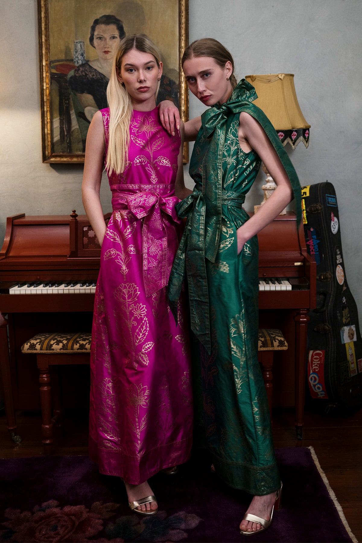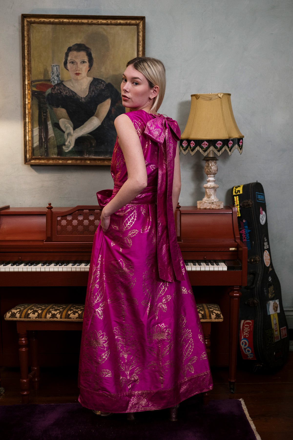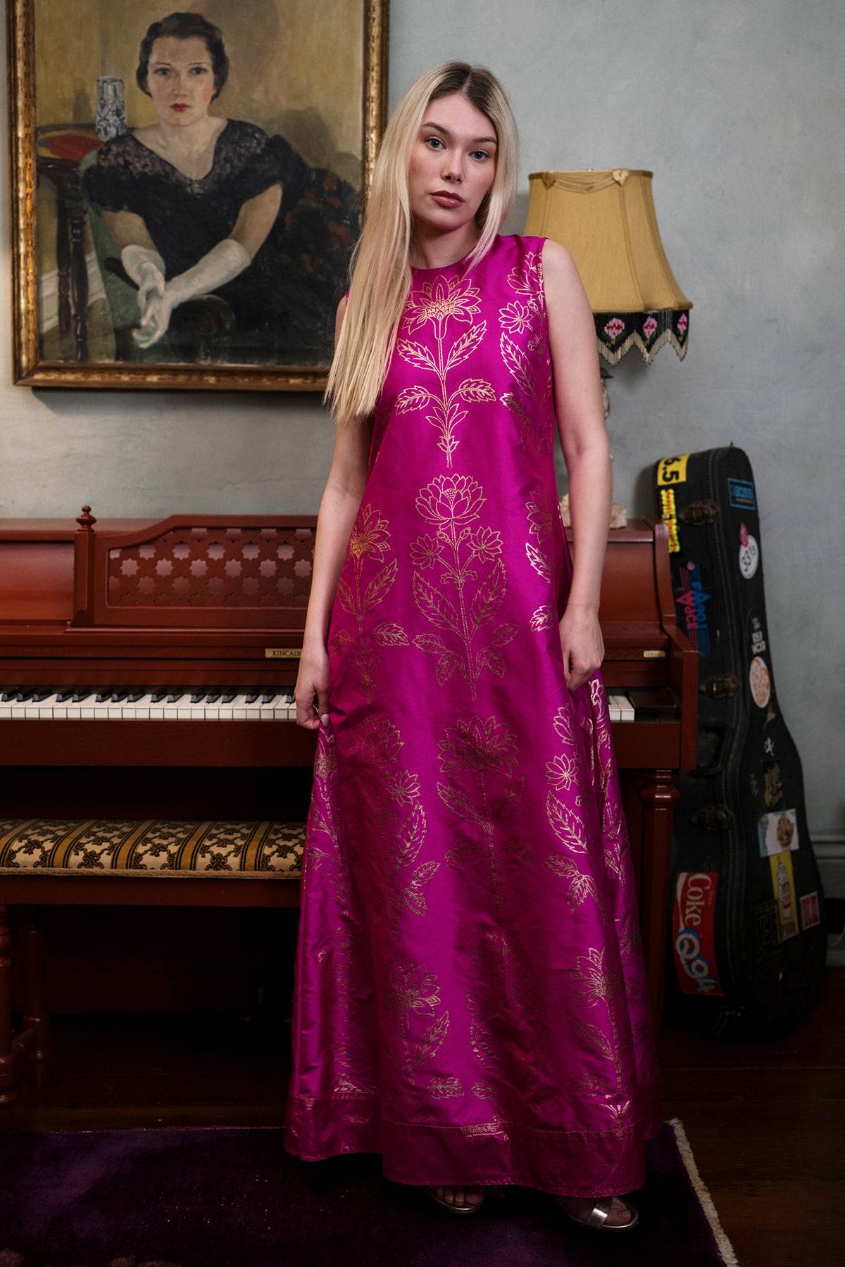 Our Fuchsia 100% silk taffeta Tibi Dress is special occasion dressing at its best and yet wonderfully comfortable. Tailored with care in luminous hand-loomed silk taffeta, this vibrant silhouette floats with ease while holding its shape beautifully. Hand-stamped gold dahlia blooms shine softly against rich color, creating a look that is both striking and refined.A universally flattering silhouette designed to move with you, the Tibi can be tied gracefully at the neck or draped low in the back for an effortless, flowing finish. Style it with the included silk sash for definition, or wear it loose and elegant for understated drama. A true showstopper — meant for entrances, celebrations, and unforgettable evenings.