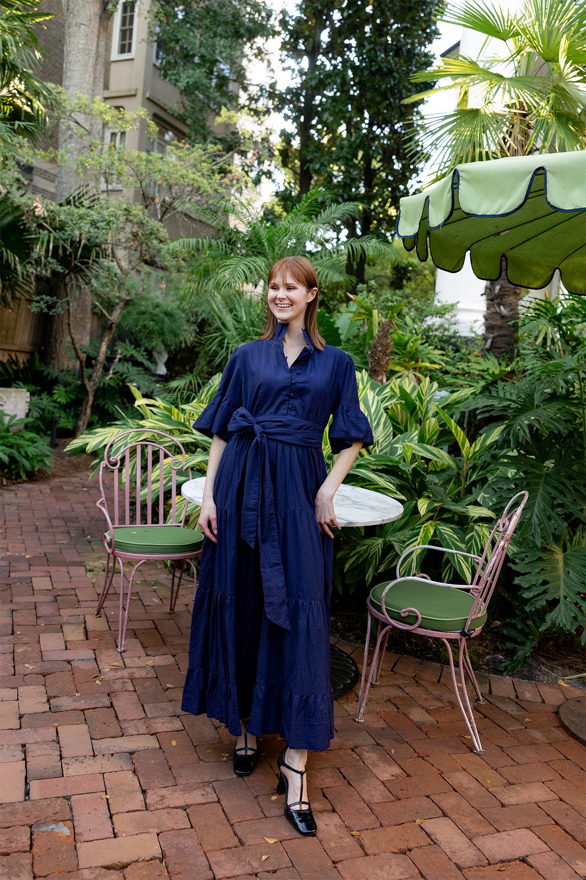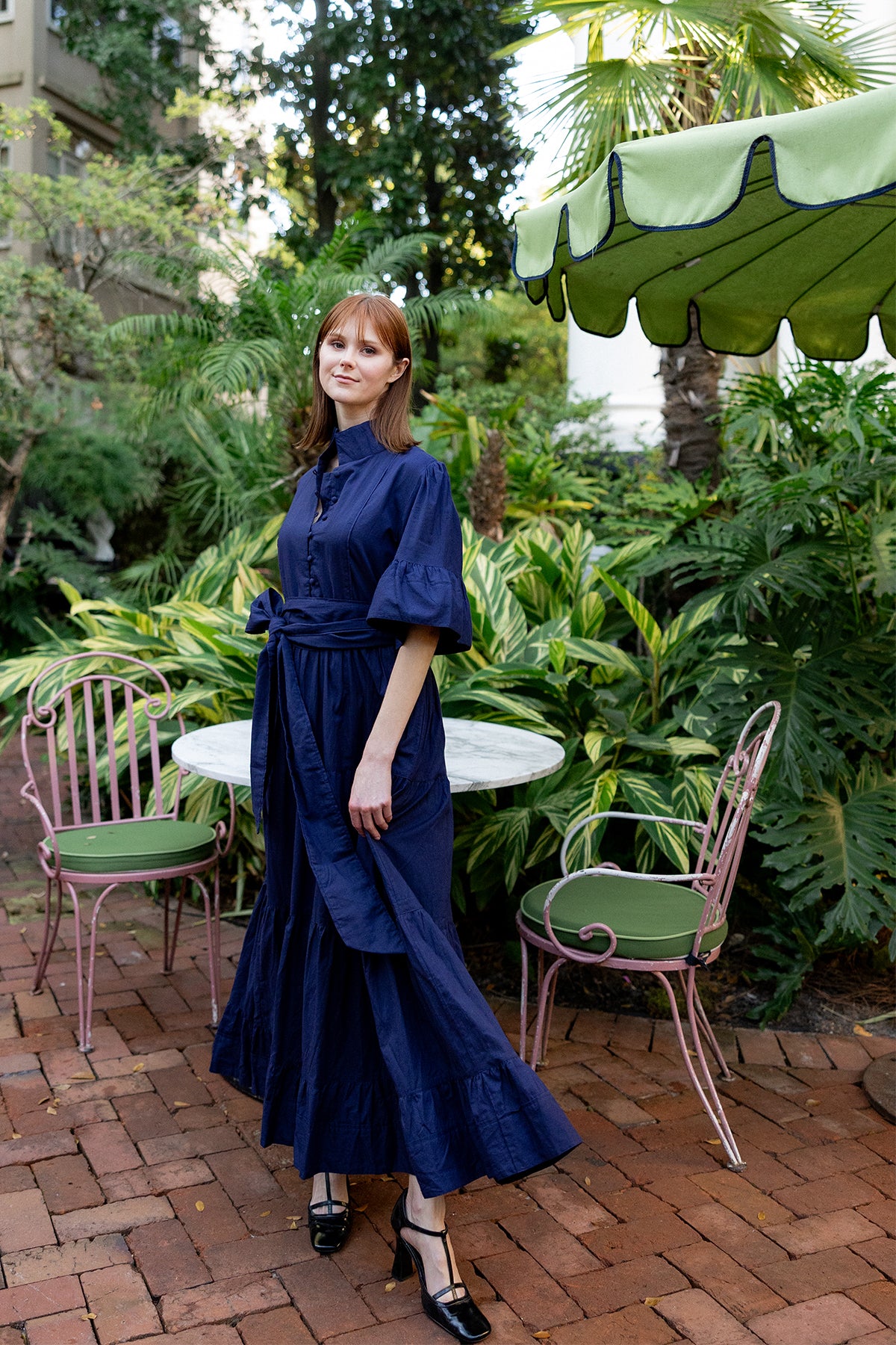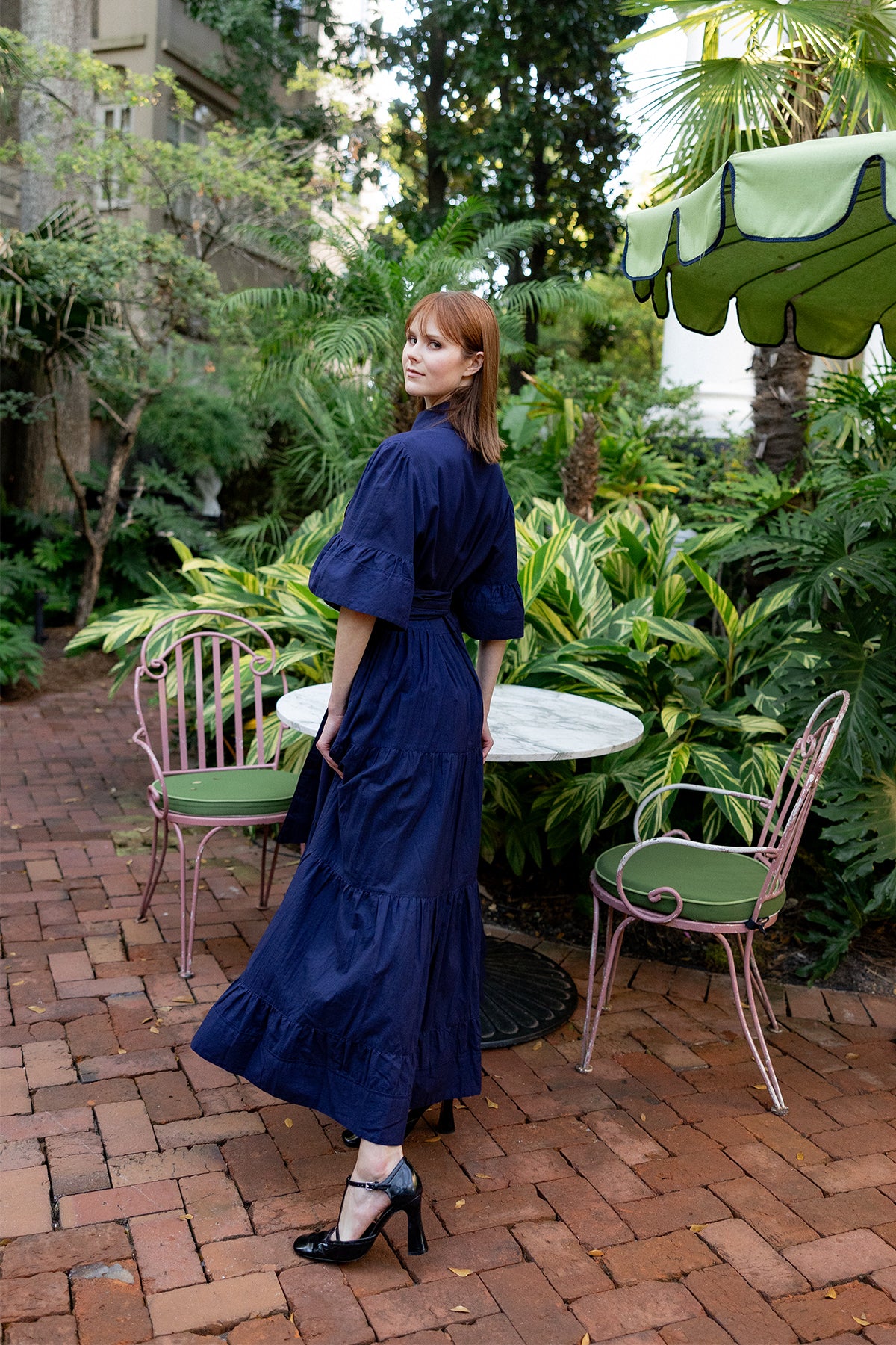 Our Hamilton Kaftan Dress style is elevated & classic in navy 100% cotton. This style has airy flutter sleeve that provide great coverage while paired back with a dramatic fully tiered a-line skirt. The band collar is face framing & flattering. Our Hamilton Kaftan can be styled to suit your needs and is perfect for work, travel or events all year long!