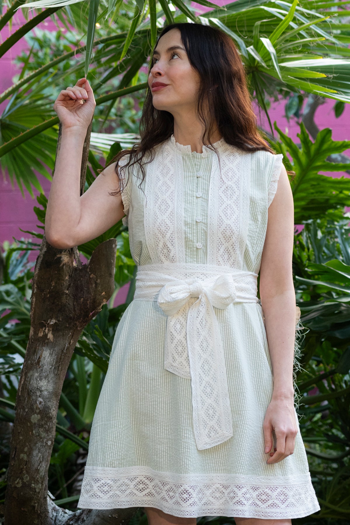 Sleeveless SUE SARTOR Flounce Mini | Sage Seersucker Lattice Crochet Lace