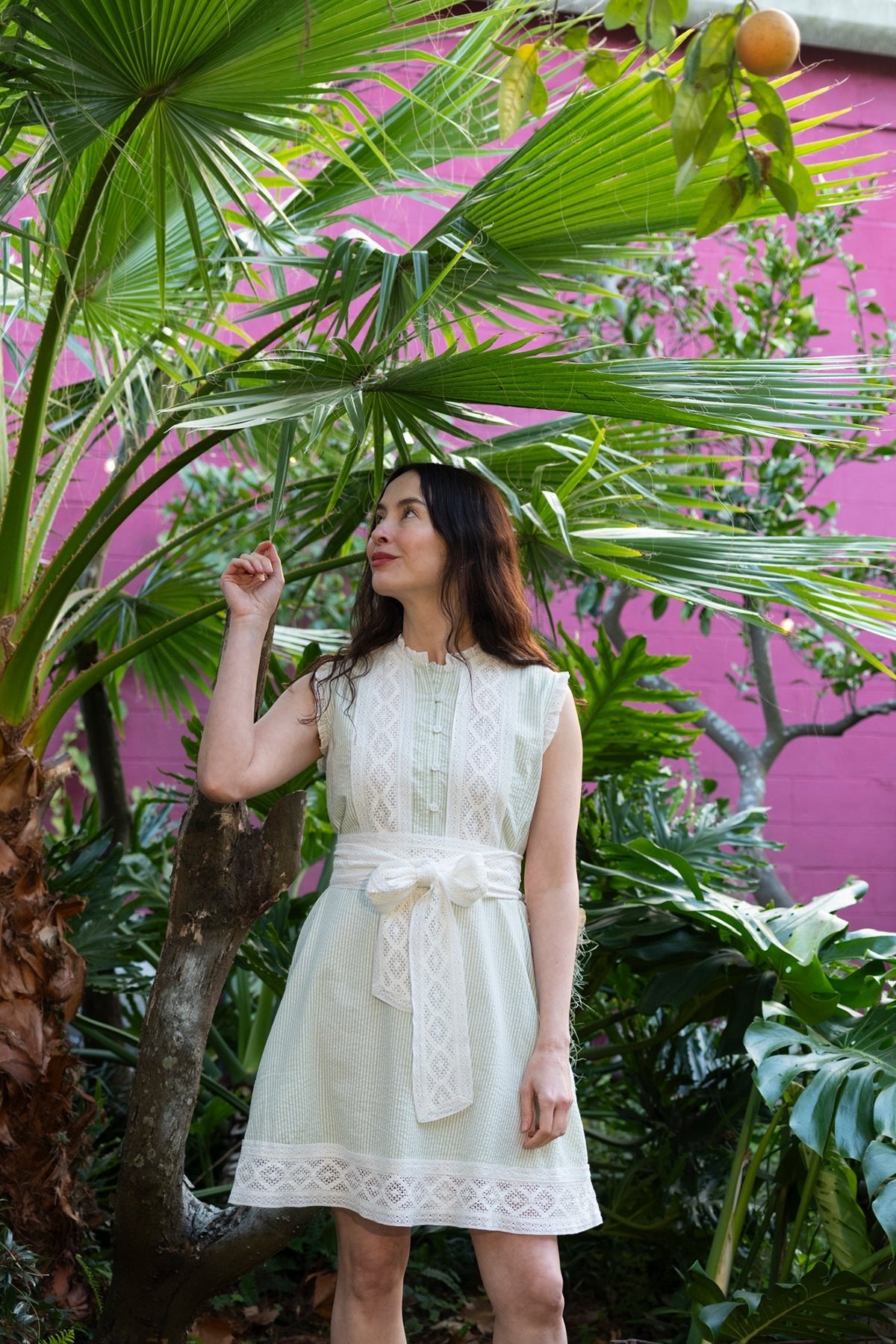 A playful take on our signature silhouette, the Sleeveless SUE SARTOR Flounce™ Mini is crafted in crisp sage green seersucker cotton for a fresh, easy summer look.• Face-framing collar• Placket button front• Contrast sash waist tie• Designed to be true to size with volume in skirt• Sleeveless mini silhouette• Side pockets• Composition: 100% cotton seersucker• Bodice is lined in light weight cotton voile