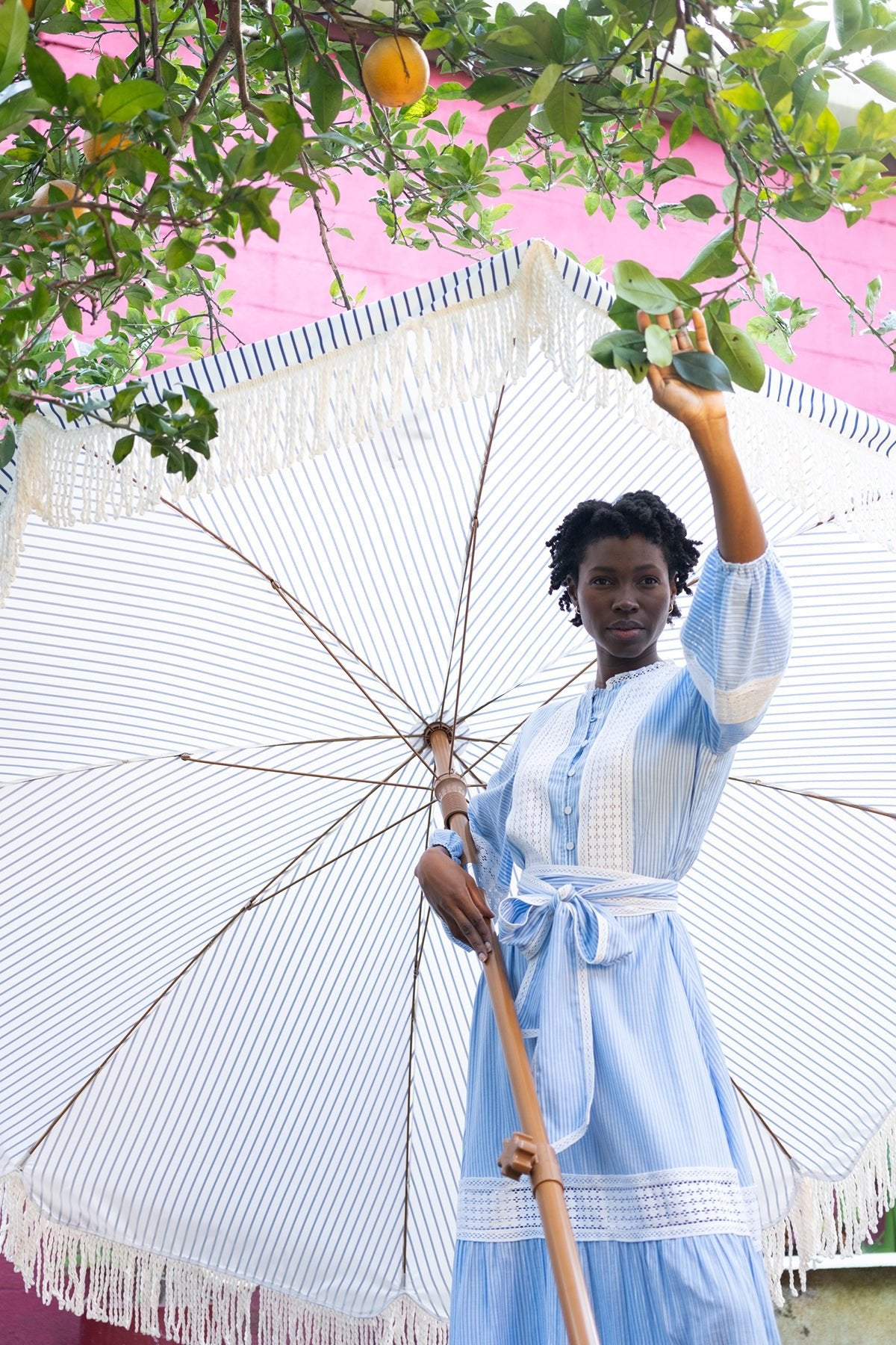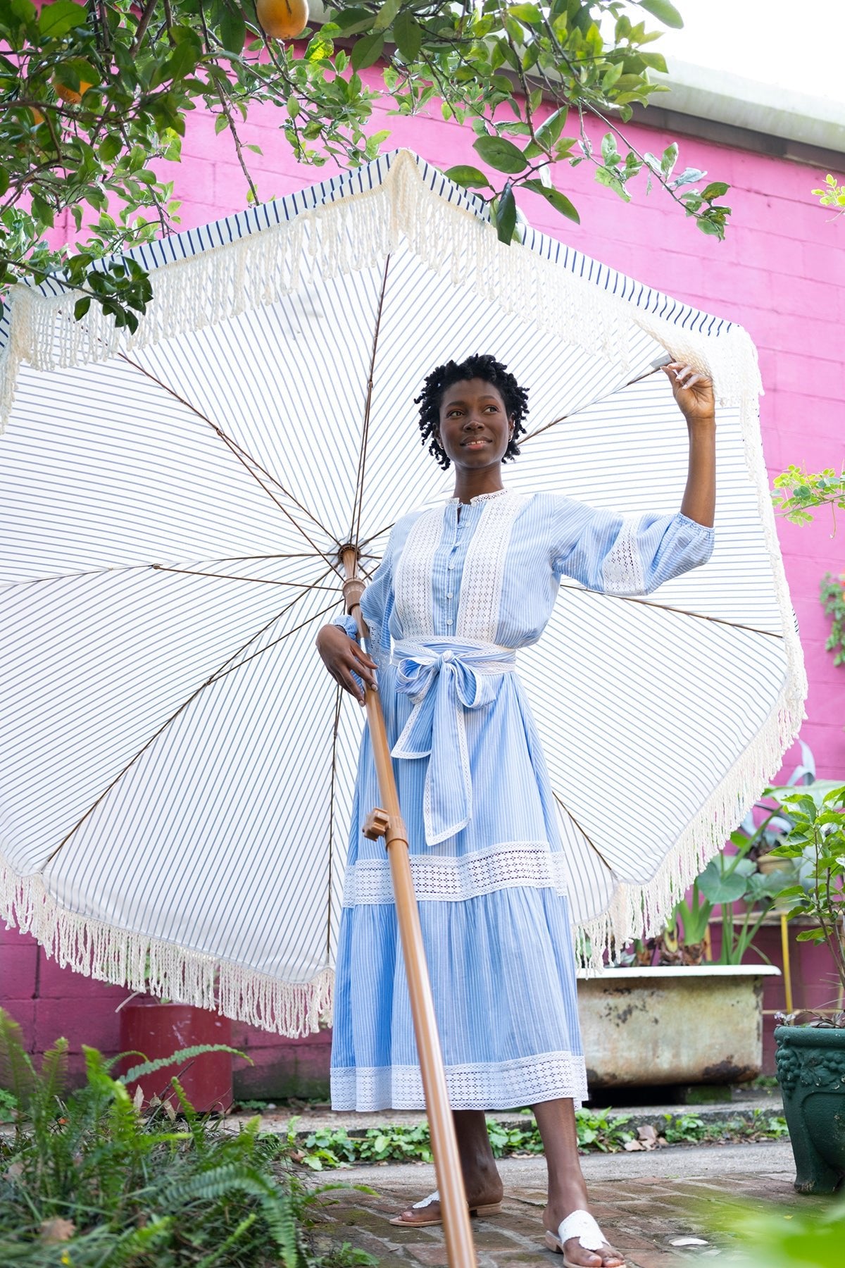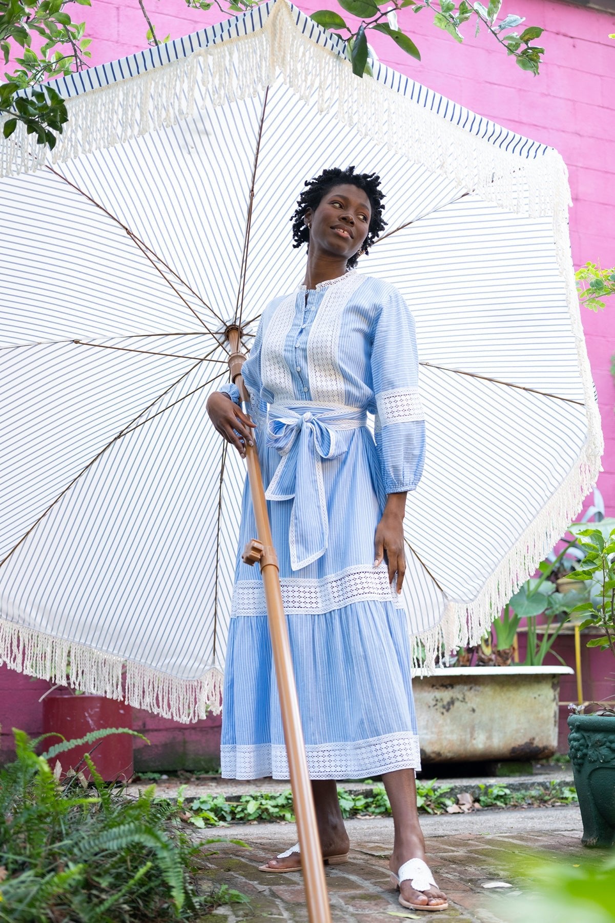 A SUE SARTOR signature, the Flounce™ Dress is crafted in crisp, soft, light weight blue and white pinstripe with heirloom ladder stitch detail and delicate garden trellis custom crochet.• Face-framing collar• Custom lace trim• Contrast sash waist tie• Button front placket • Designed to be true to size with volume in skirt• Bodice lined with light weight cotton voile• Side pockets• Composition: 100% cotton