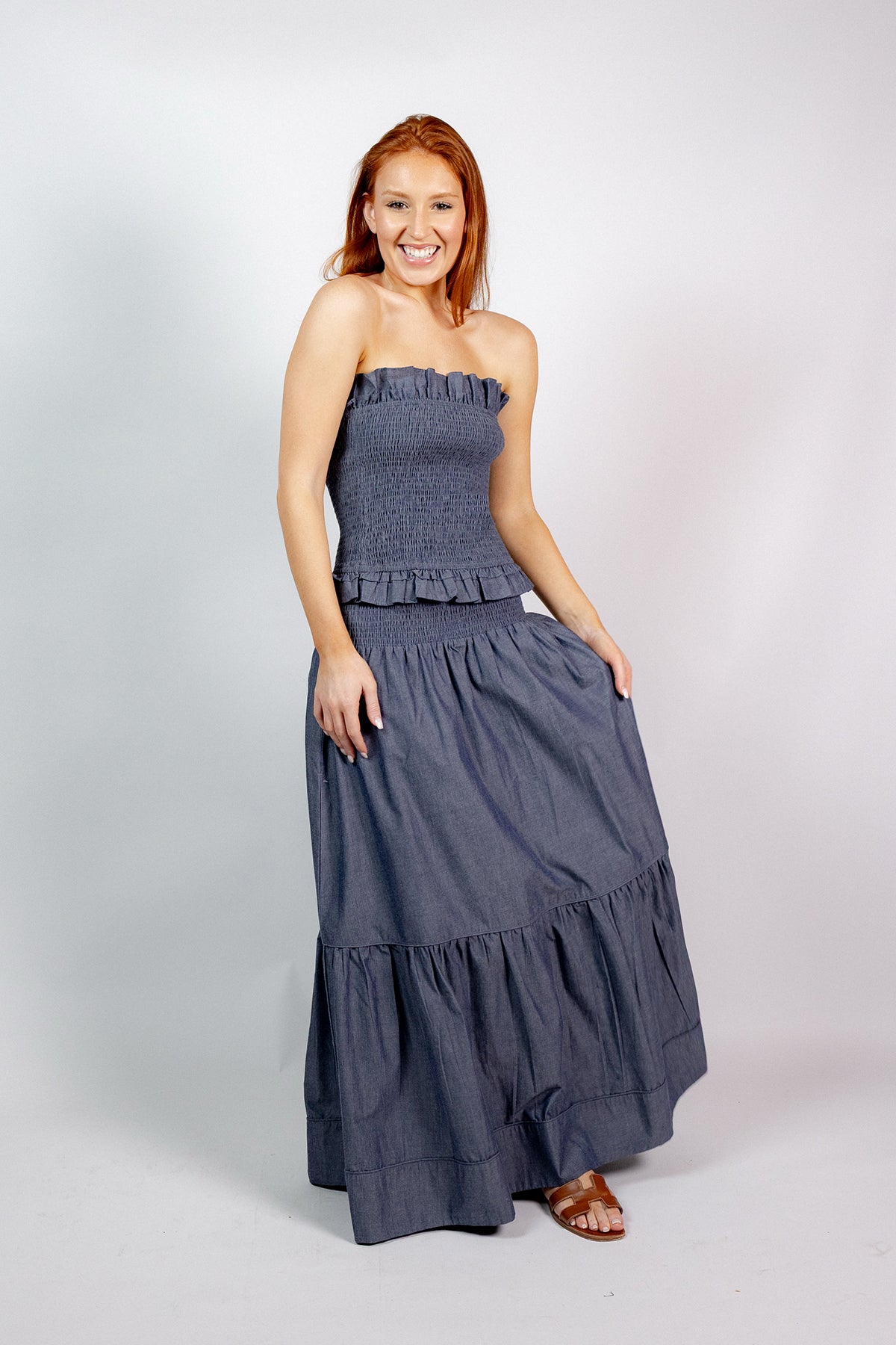 SUE SARTOR Flounce™ Smocked Waist Skirt | Indigo Chambray
