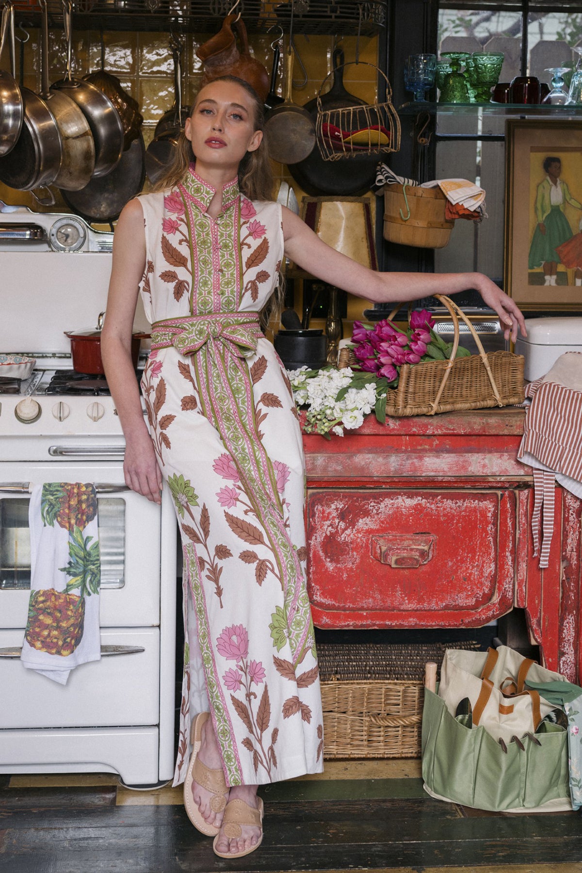 Our large-scale Dahlias have been a best-loved for years, and now we’ve re-imagined them with hints of pink, peridot green, and honey. The result is a bohemian neutral that truly goes with everything… and only gets better with each wear. Offered in our Sleeveless Marrakech Kaftan with special details - elongating seams, contrast-lined banded collar, functional button front placket for versatility, and optional sash. Paired with a fun shoe for events, or a sandal for a more casual look, this piece is sure to be a year-round go-to!
