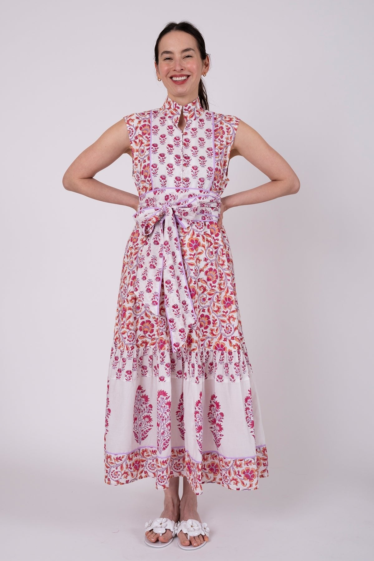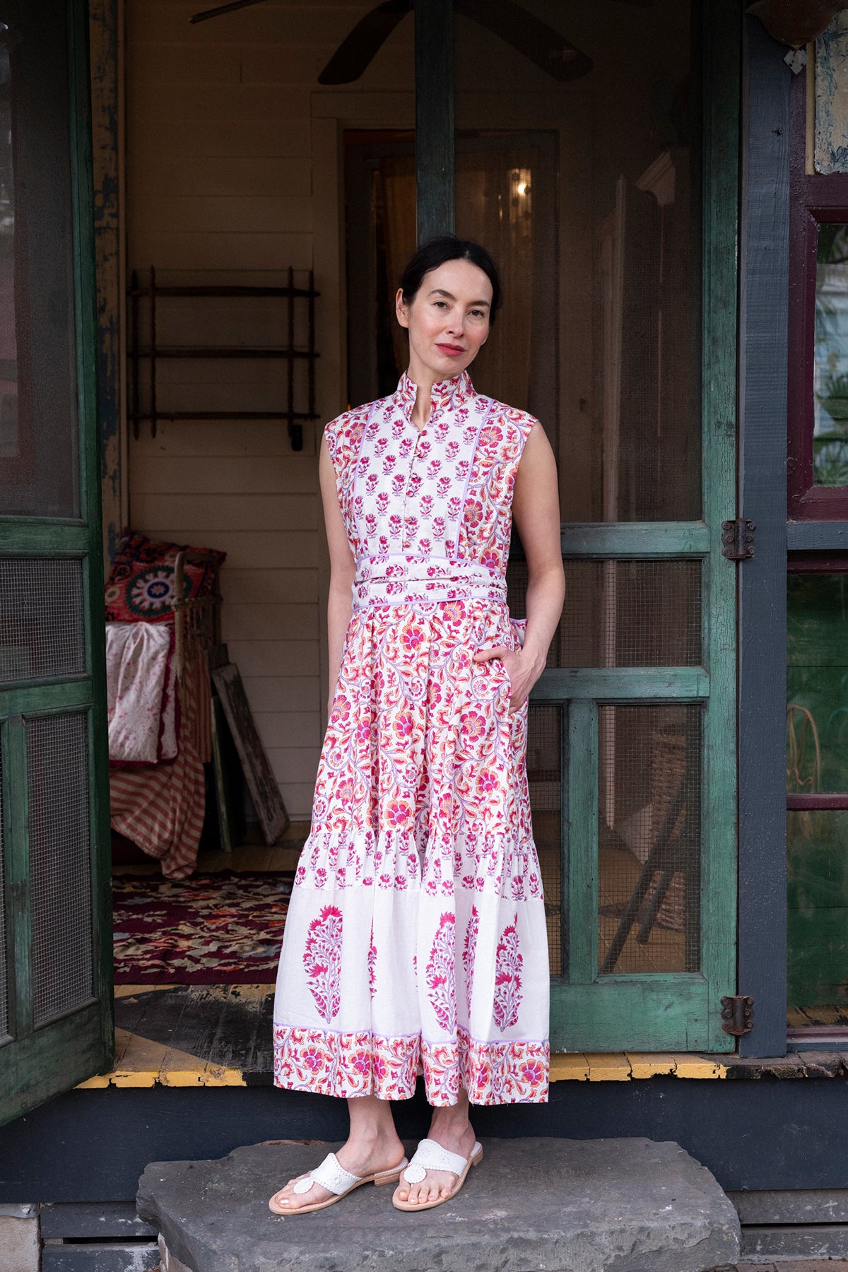 Cassis is a sunlit pink with a bright splash of berry. Paired with soft lavender hand-pipe, it’s pure Mood Lift. Our Victorian Frieze Print Series features swirling dianthus blooms which meet a cheerful repeat of tiny rosebuds in a print that feels as fresh as spring itself. Our signature floral frieze motifs and custom borders are placed with care, finishing each dress like a wearable work of art. This print series features our Sleeveless SUE SARTOR Flounce dress. Crafted in 100% cotton and made in small batches, each garment is created with thoughtful details: a button-front placket, face-framing banded collar, side-seam pockets, tiered skirt, and contrast hand-piping.