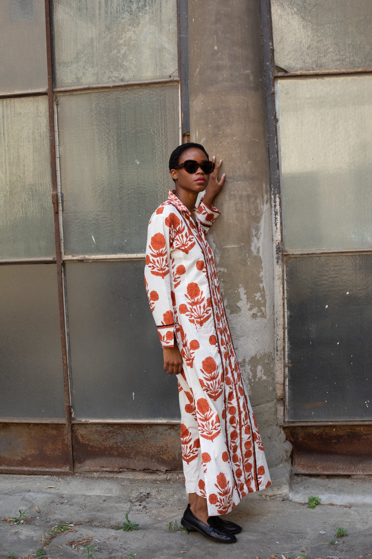 Our Marrakech Kaftan designed with 100% cotton hand-dyed block print. This best selling silhouette in our signature SUE SARTOR Marigold © 2024 Print Series is hand-illustrated and artisan block printed in the classic terracotta colorway. This reimagined in-house Marigold Collection has been a true project of the heart. This prolific “flower of the sun” is synonymous with our brand. It is symbolic of our desire for all of our prints and garments to be “made with love,” integrity, purpose, and quality. We adore this Marrakech Kaftan dress style with its long, flattering lines and flowing side slits. The button-front placket makes this a versatile piece, wearing it open or closed.