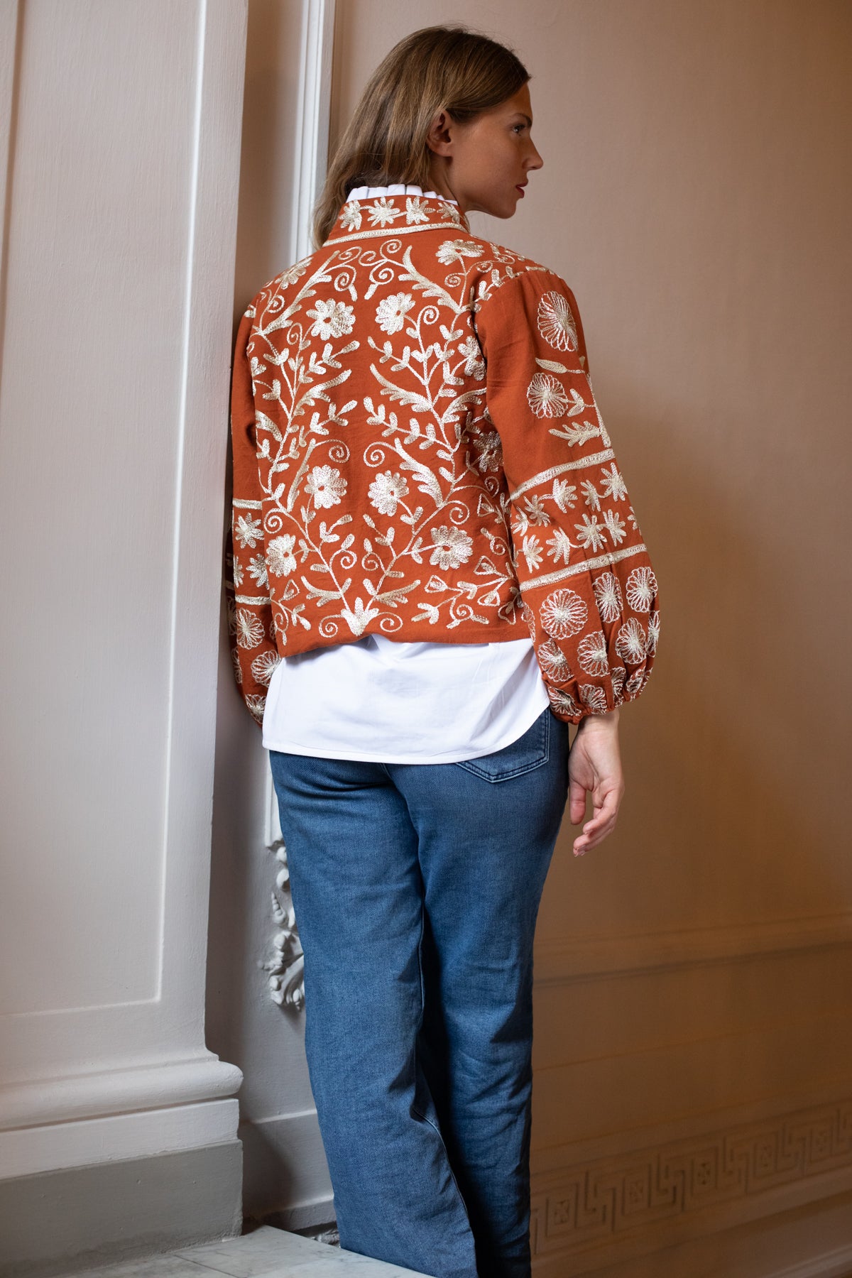 Our Suzani Blouson Jacket in terracotta is the ultimate layering workhorse—timeless, seasonless, and joyfully detailed. Each one is crafted by a family of artisans using hand-dyed cotton and intricate silk embroidery, featuring our signature floral frieze and winding botanicals. With voluminous sleeves that slip effortlessly over our SUE SARTOR Flounce™ dresses, knitwear, or your favorite blouse, and hidden hook-and-eye closures for versatile styling, this piece is as functional as it is artful. Don’t forget to style it with your denim this fall.