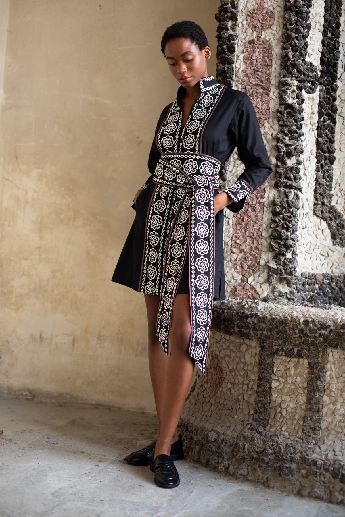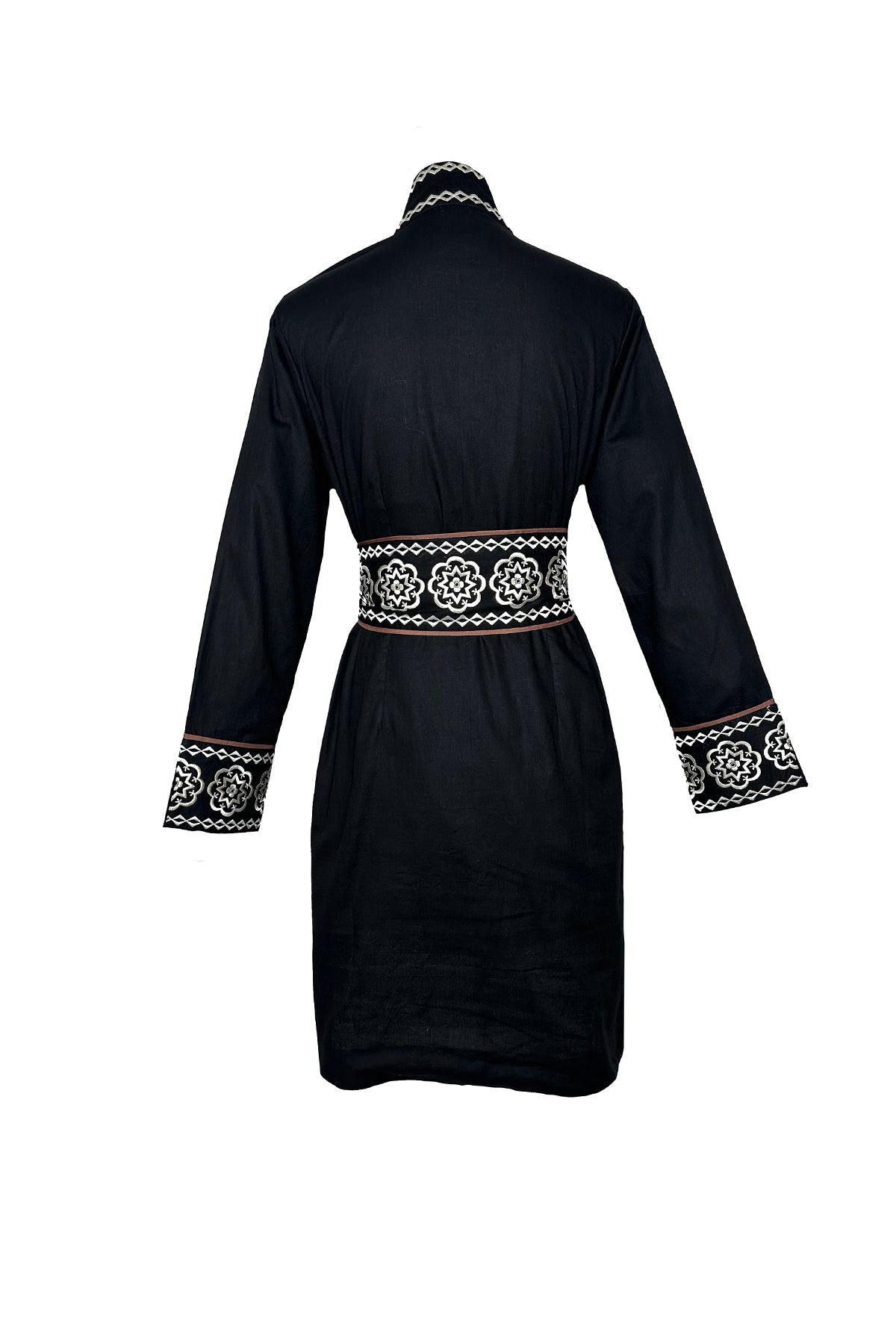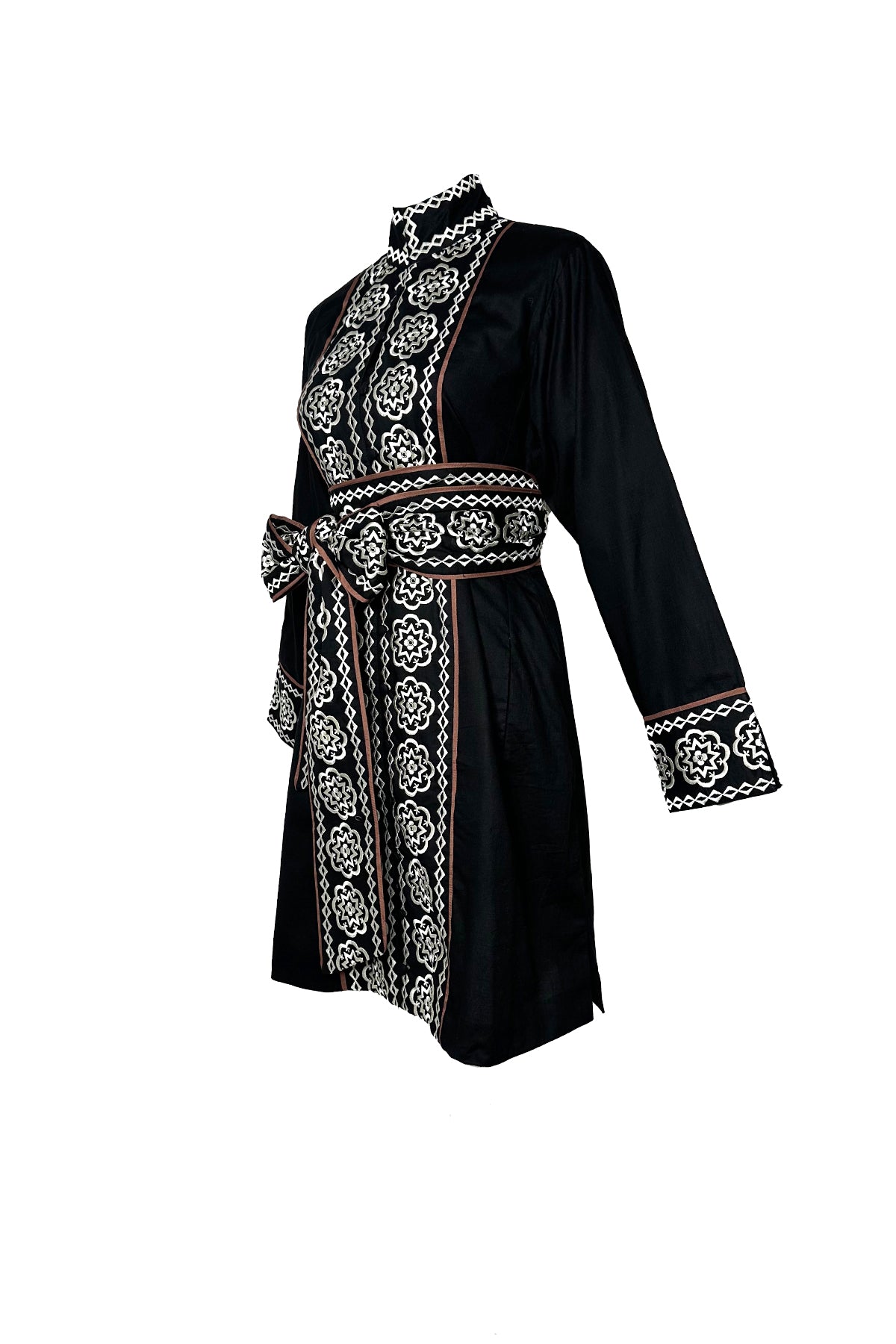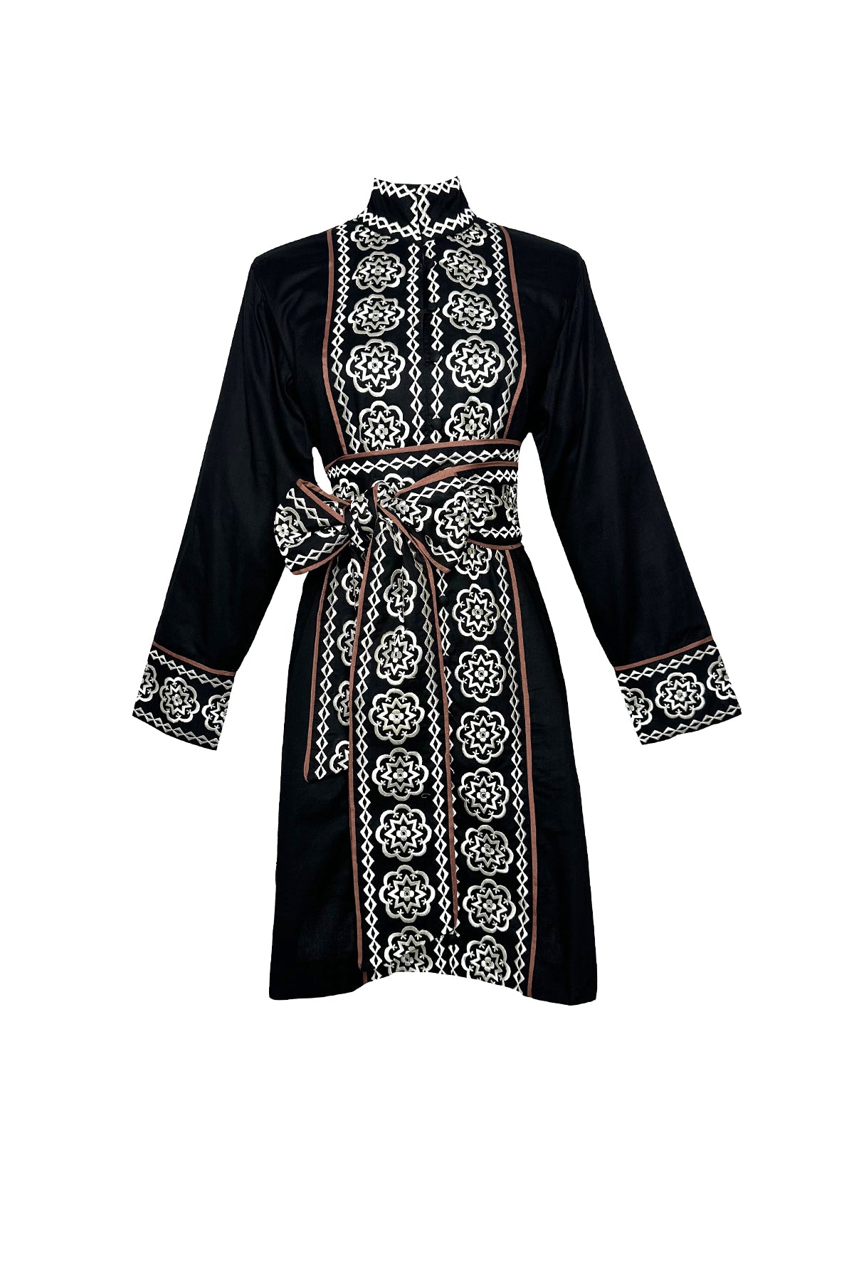 Our Piazza © 2025 Embroidery is meticulously rendered in 100% silk threadwork on crisp cotton…a study in craftsmanship and detail. The Marrakech Short Kaftan Dress reimagines the classic shirt dress with an extra dose of style, pairing effortless elegance with true versatility. Chose to style it with or without the sash depending on the look your desire. Its motif draws inspiration from the intricate detailing surrounding the Duomo’s rose window, translated into embroidery that feels both timeless and modern. In deep black with espresso-brown contrast piping, it’s a fall-perfect palette you’ll reach for again and again.