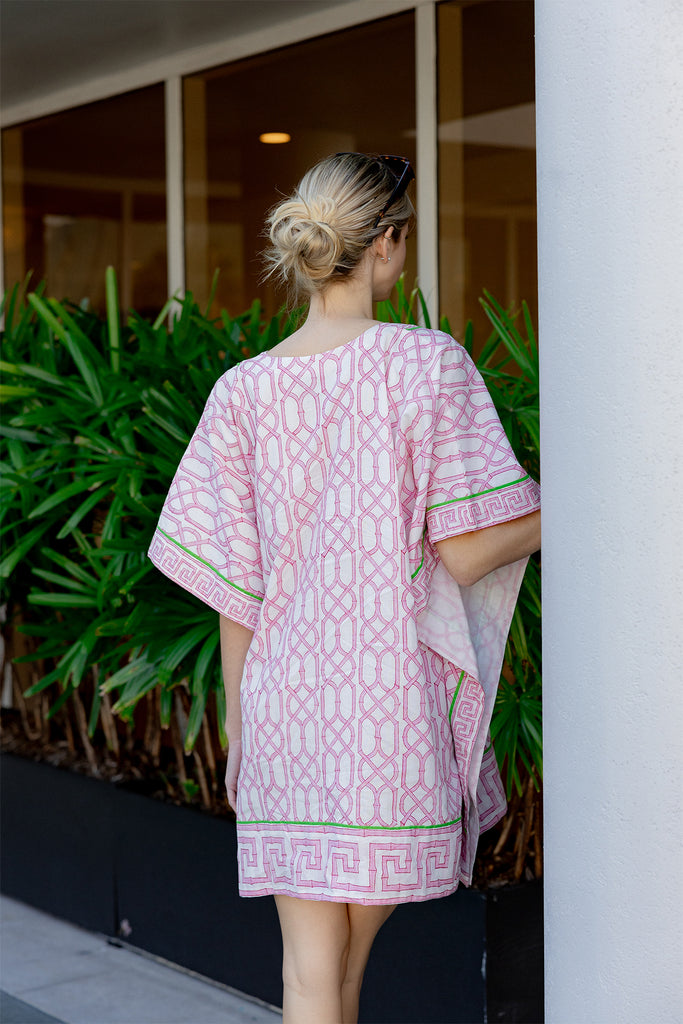 Our 35" Square Neck Beach Kaftan is back as a travel-ready must have for all of your vacation getaways and fun days by the pool. We are loving this bright mix of hibiscus pink colorway paired back with key lime green contrast piping, which reminds us of classic beach retreats.
