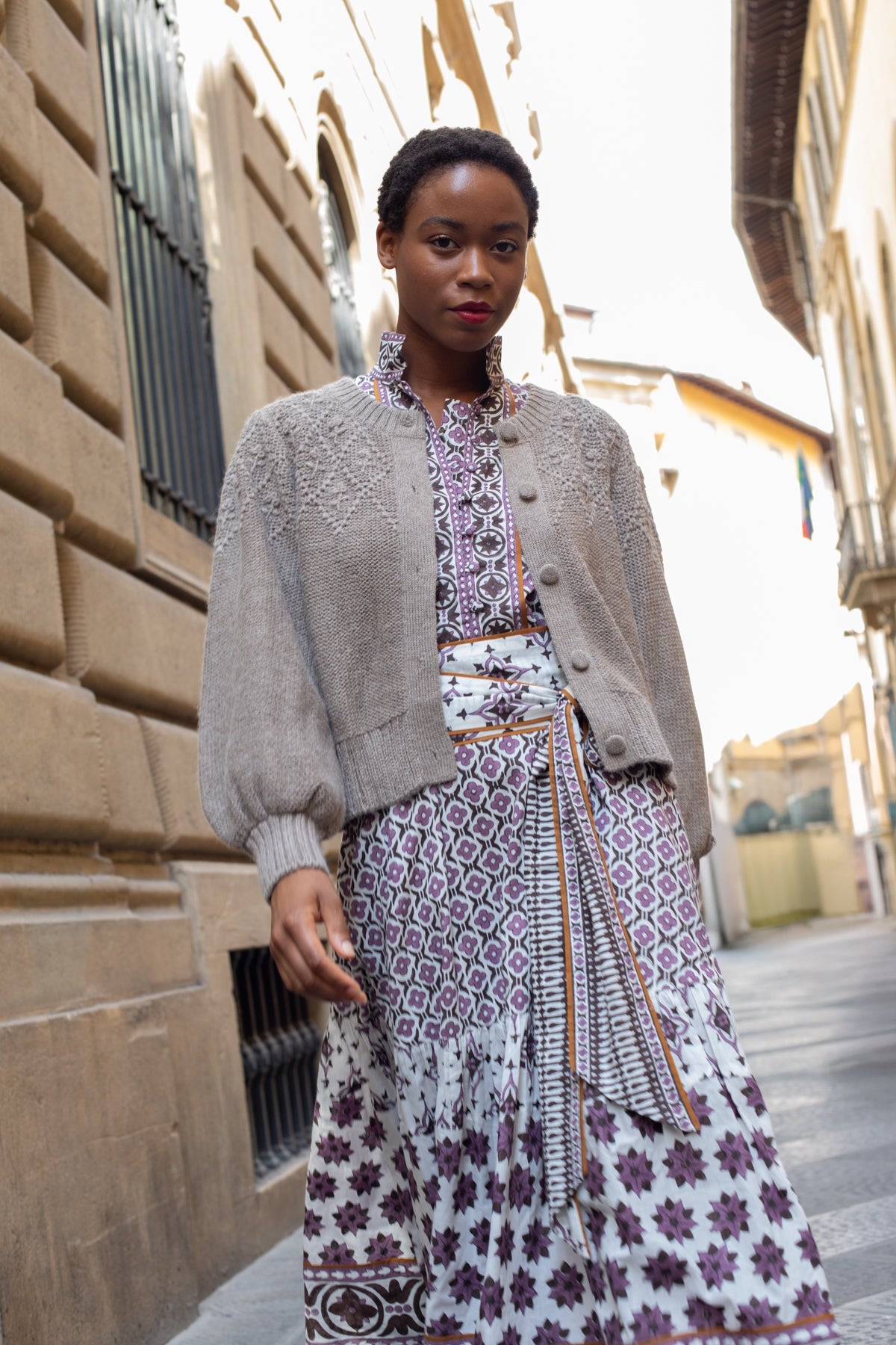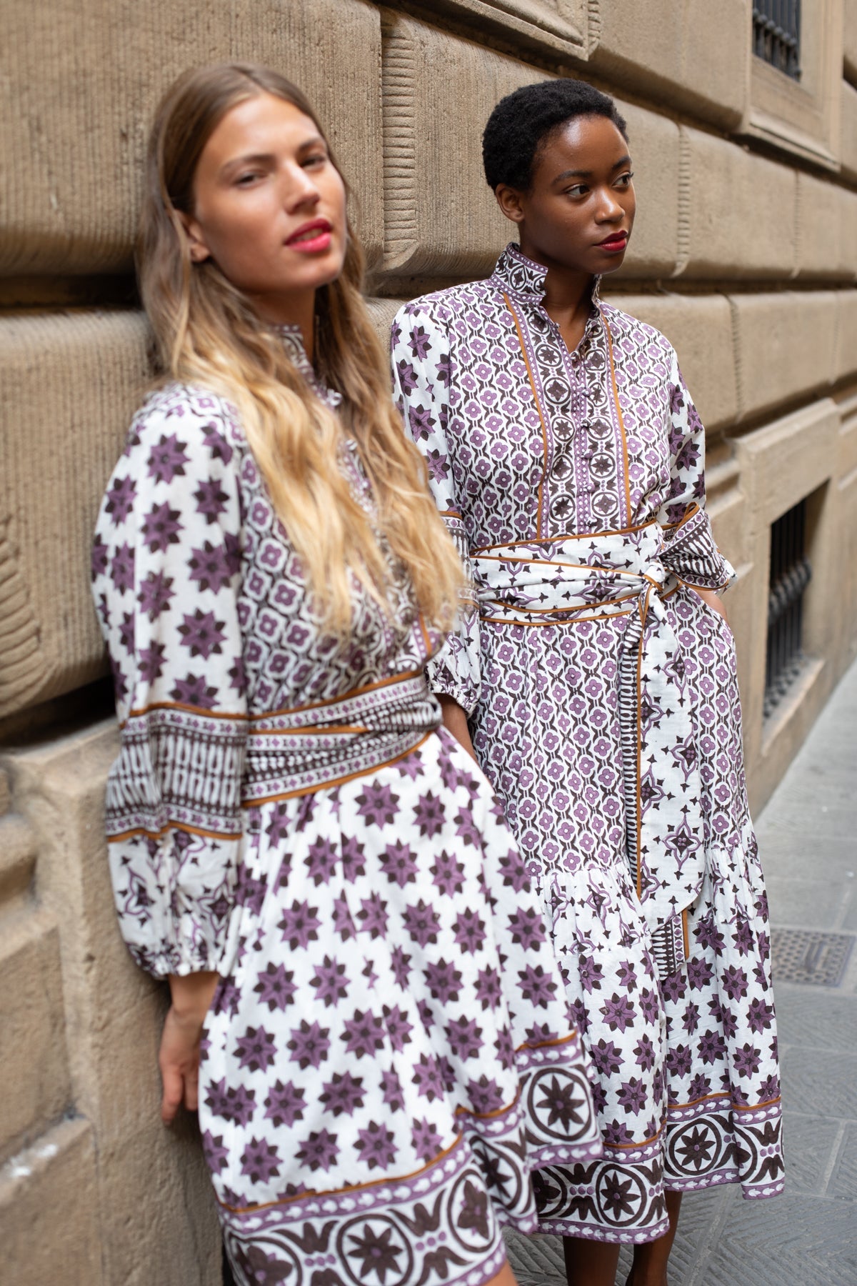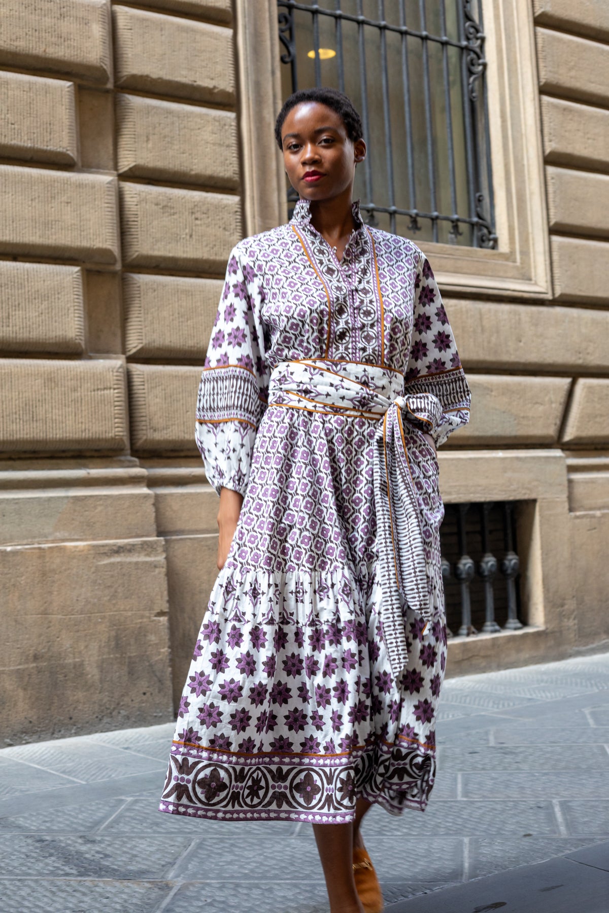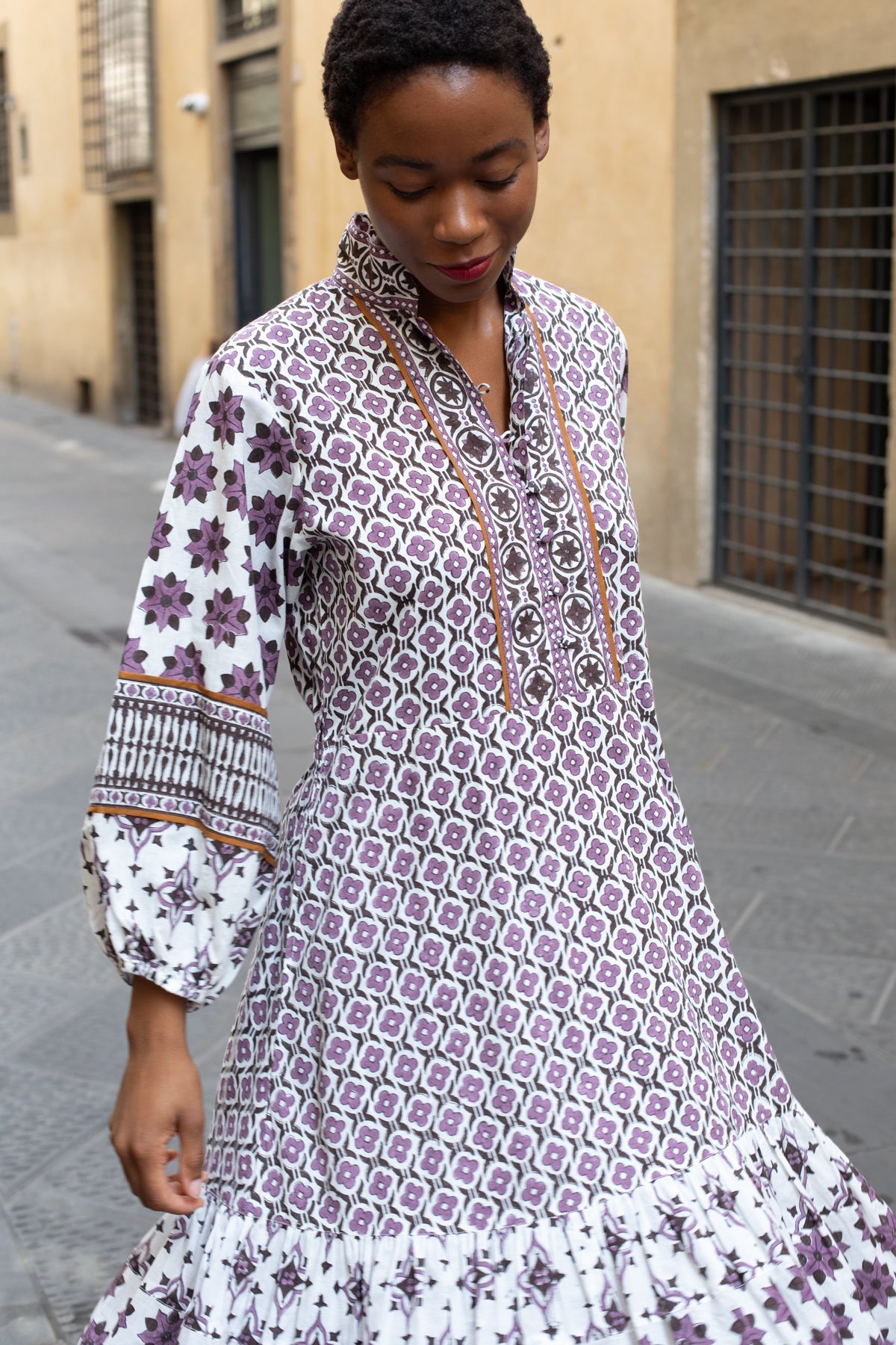 Our hand illustrated artisan block prints are so unique and truly works of art. We are now offering our best selling SUE SARTOR Flounce™ dress in another fresh fall color way in the Fiore © 2025 Print Series. The combination of perfect plum purple and chocolatey espresso brown feels effortlessly put together for fall, yet joyful enough to wear well into the holiday season. “Fiore”, Italian for flower, symbolizes seasonal shifts and the growth that comes with a fresh season. Our hand-illustrated motifs from this print series are inspired by the architectural details found in some of our favorite Florentine spaces.