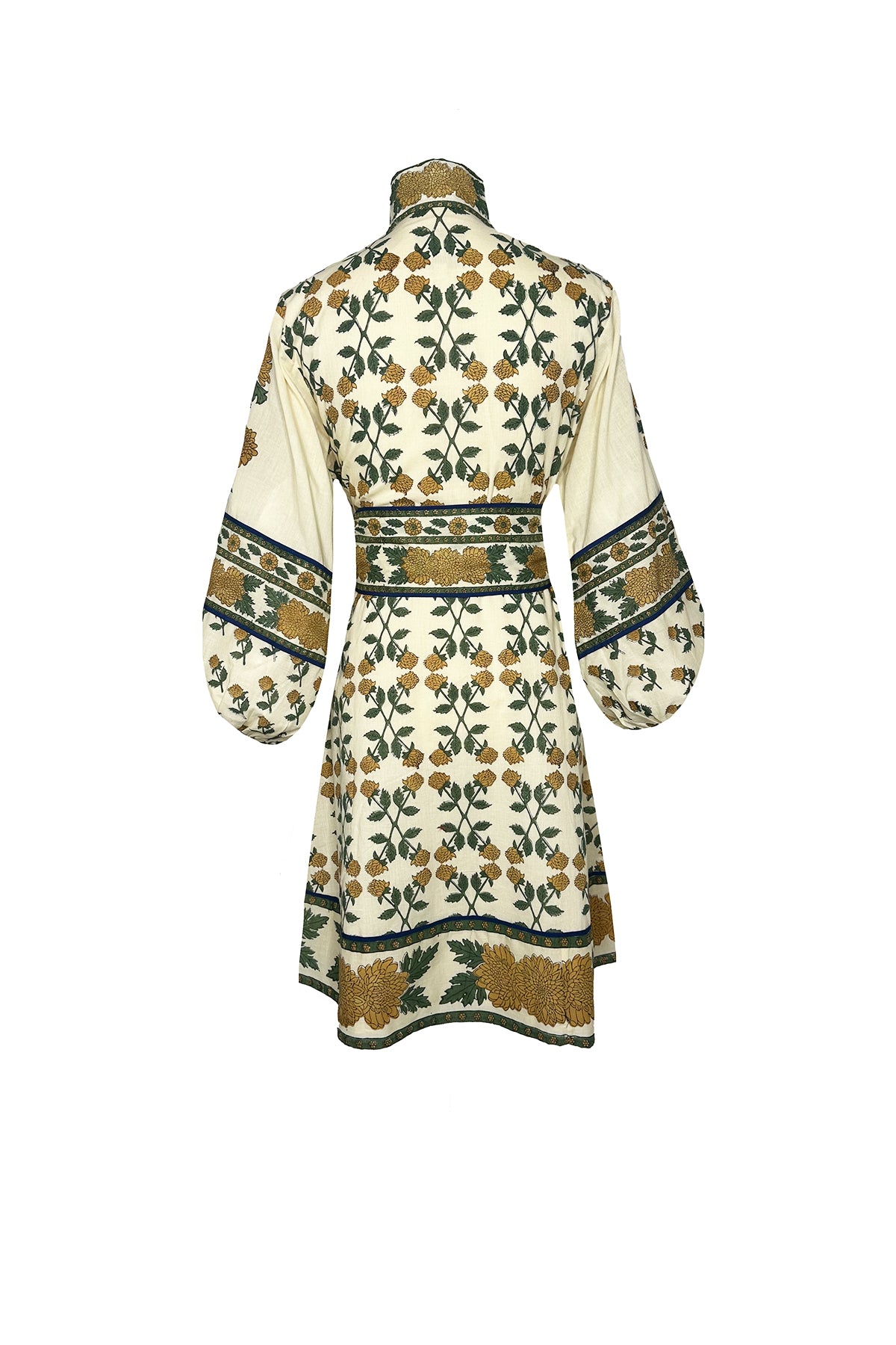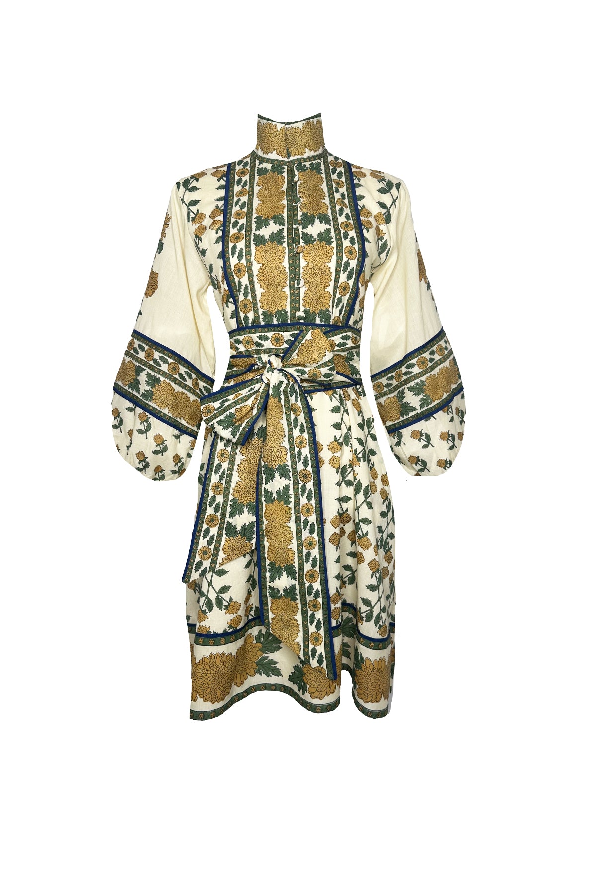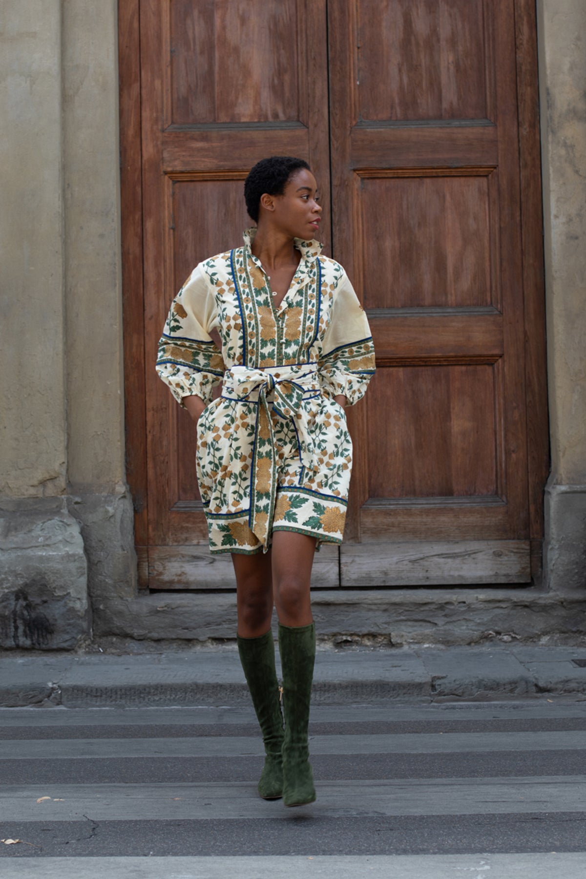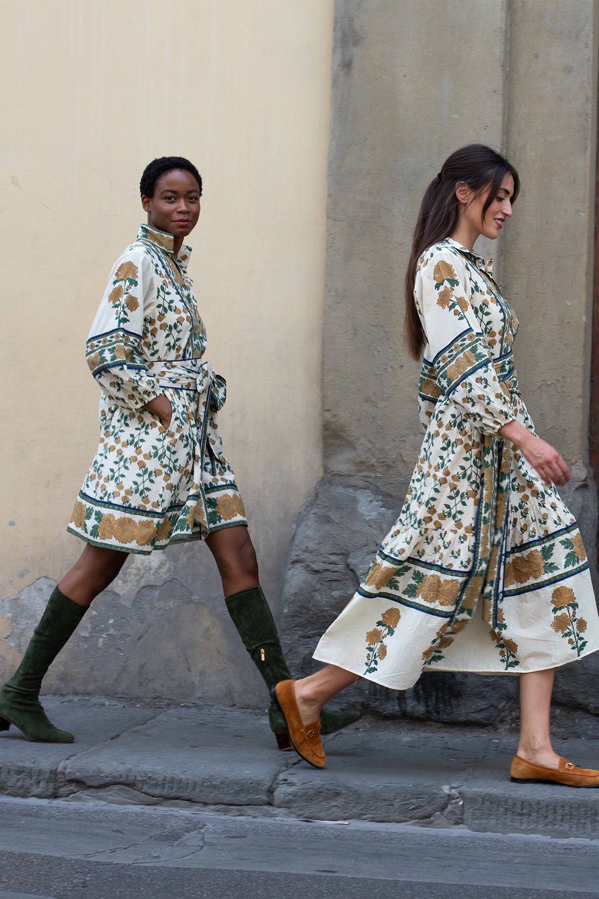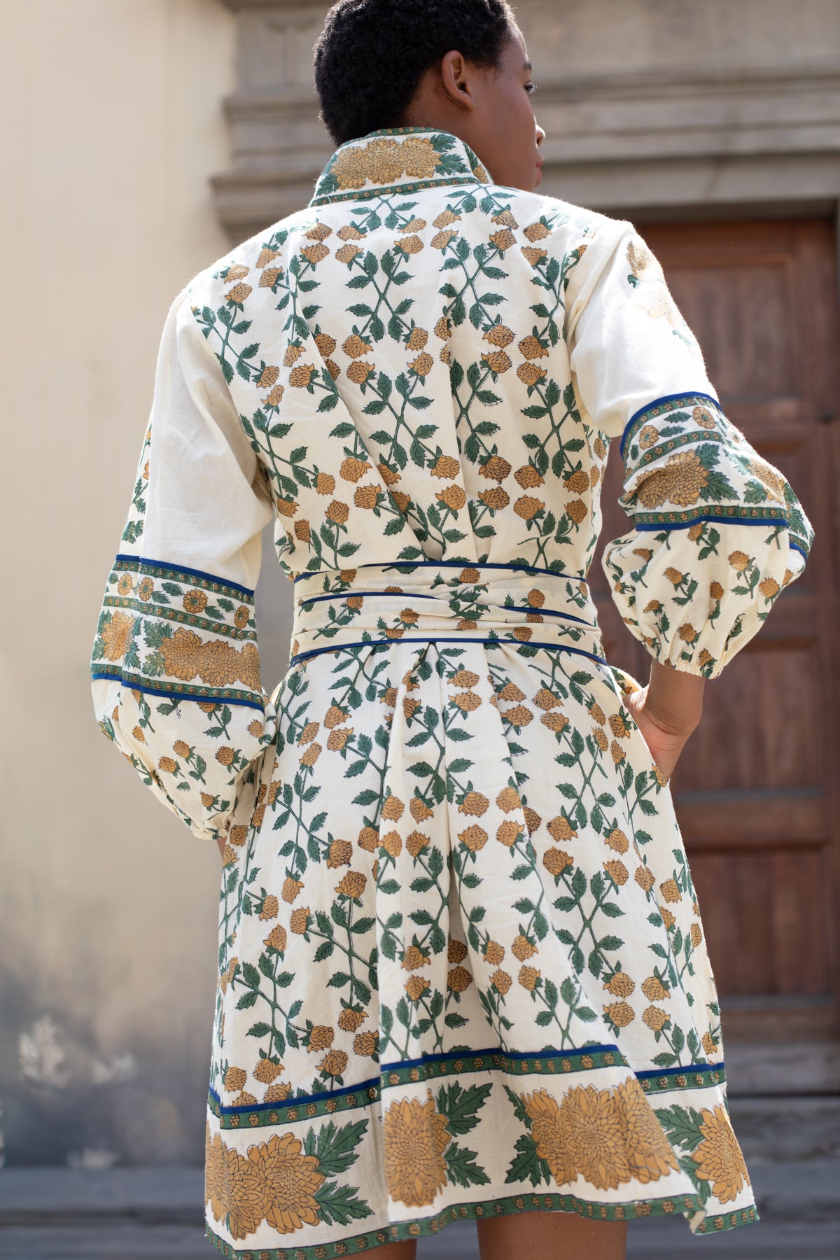Our artisanal Mum © 2025 Print Series in the rich honey and olive green, with a pop of navy blue contrast pipe radiates the warmth of a perfect autumn day. From the first signs of fall through the Thanksgiving season, this timeless beauty is one we’ll be reaching for on repeat. We love this inviting print series in the best selling SUE SARTOR Flounce™ Shorty, which is sure to be your go-to for the fall months ahead. Each print is hand-illustrated and hand block printed one-by-one, and every style is made with love by our in-house tailors and artisans.