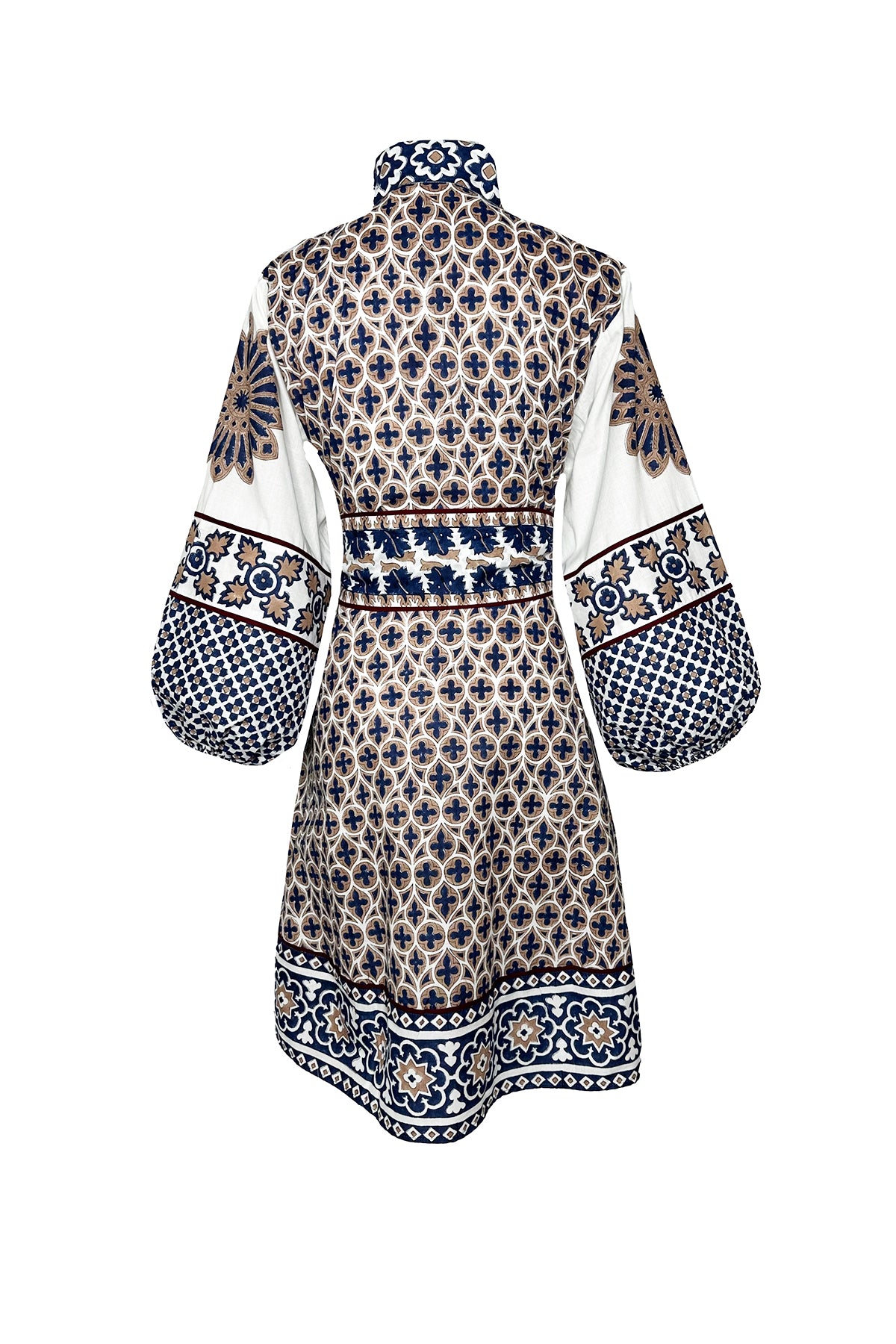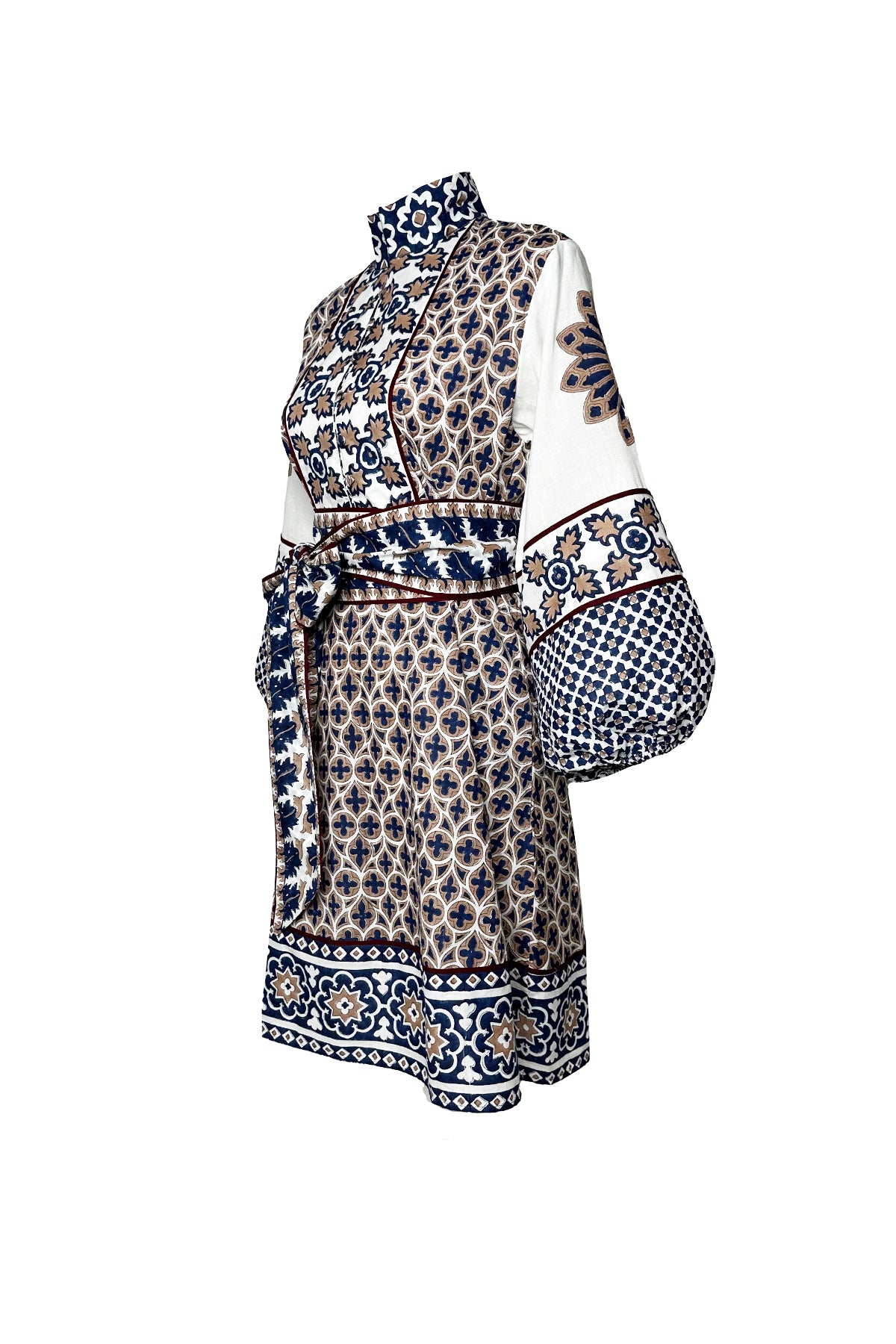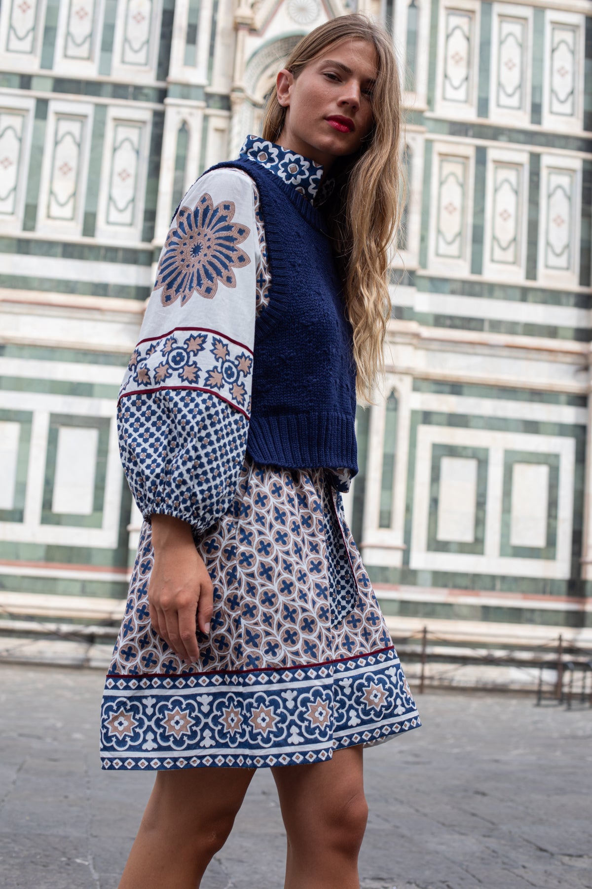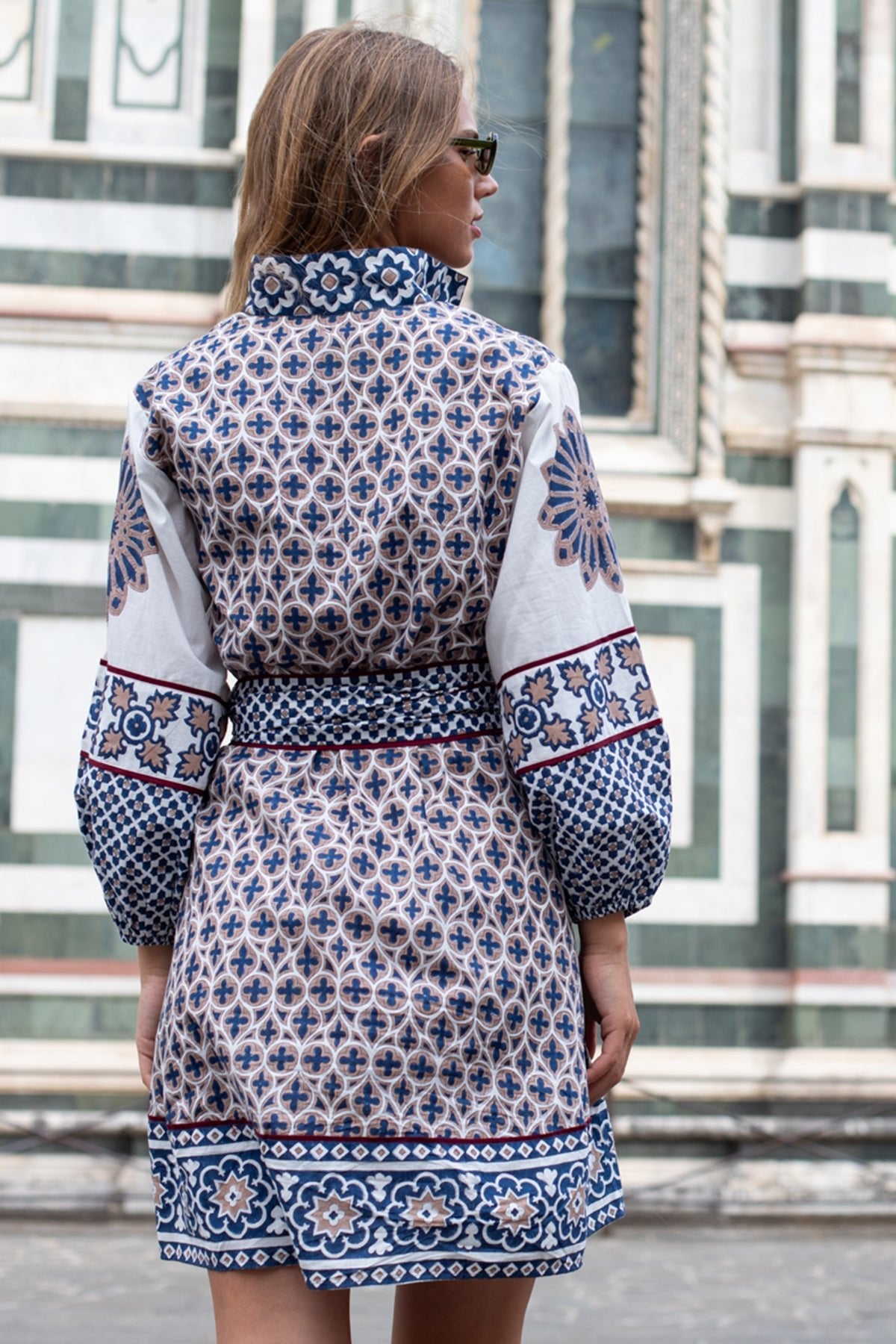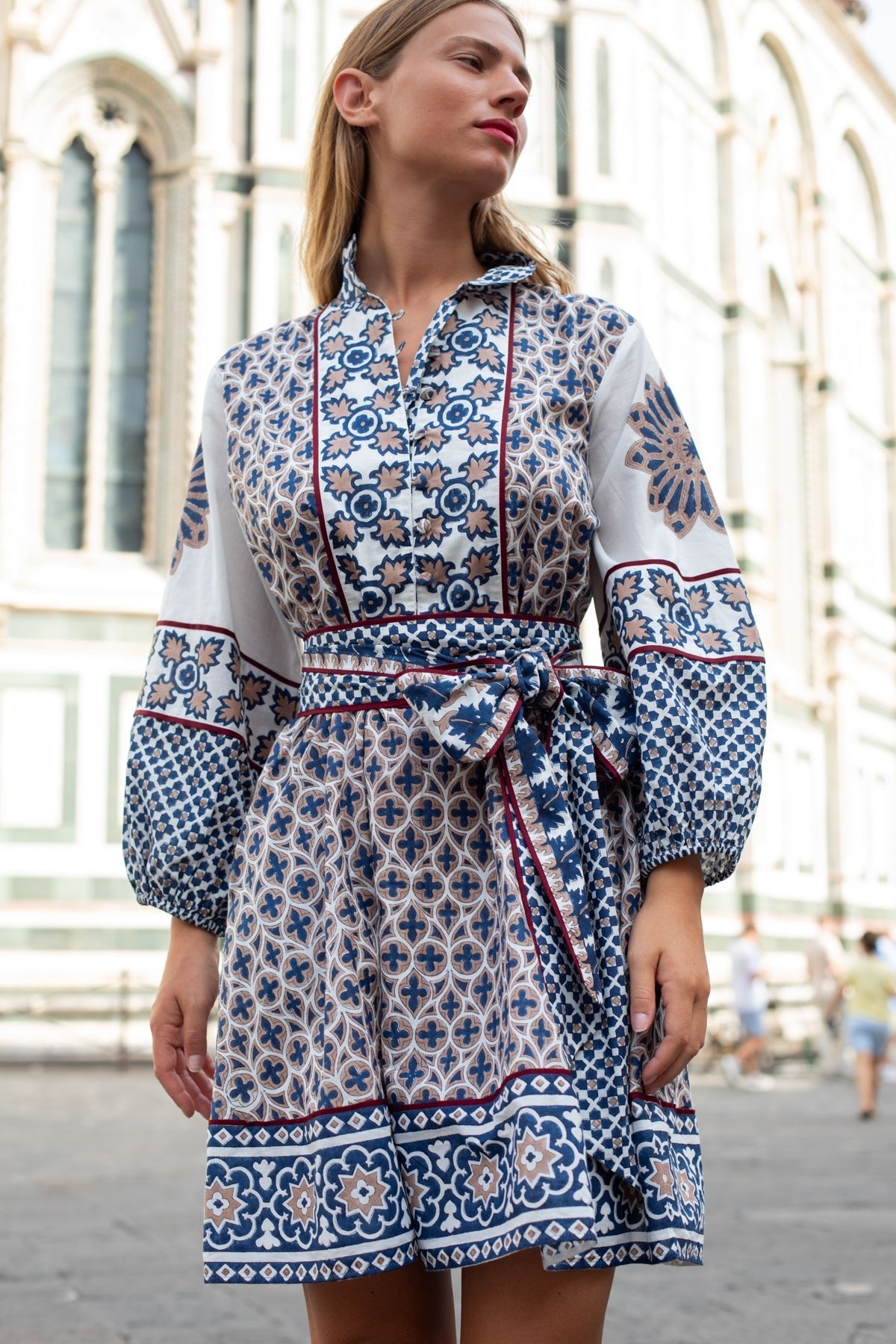Our hand-illustrated Piazza © 2025 Print Series gives a warm elegance to our timeless SUE SARTOR Flounce™ Shorty dress for the autumn season. Inspired by the intricate architectural details of Florence’s piazzas, with a nod to the Duomo, this autumnal beauty weaves together acanthus leaves, rose window motifs, and timeless quatrefoil patterns. The rich mocha brown and deep navy, accented with hand-piped burgundy, create a palette that’s effortlessly elegant. Crafted in breathable 100% cotton and made in small batches, each garment is created with thoughtful details: a button-front placket, face-framing banded collar, side-seam pockets, and contrast hand-piping. Wear it with boots and a cozy knit for crisp fall days, or style it solo as a one-and-done staple that takes you anywhere.
