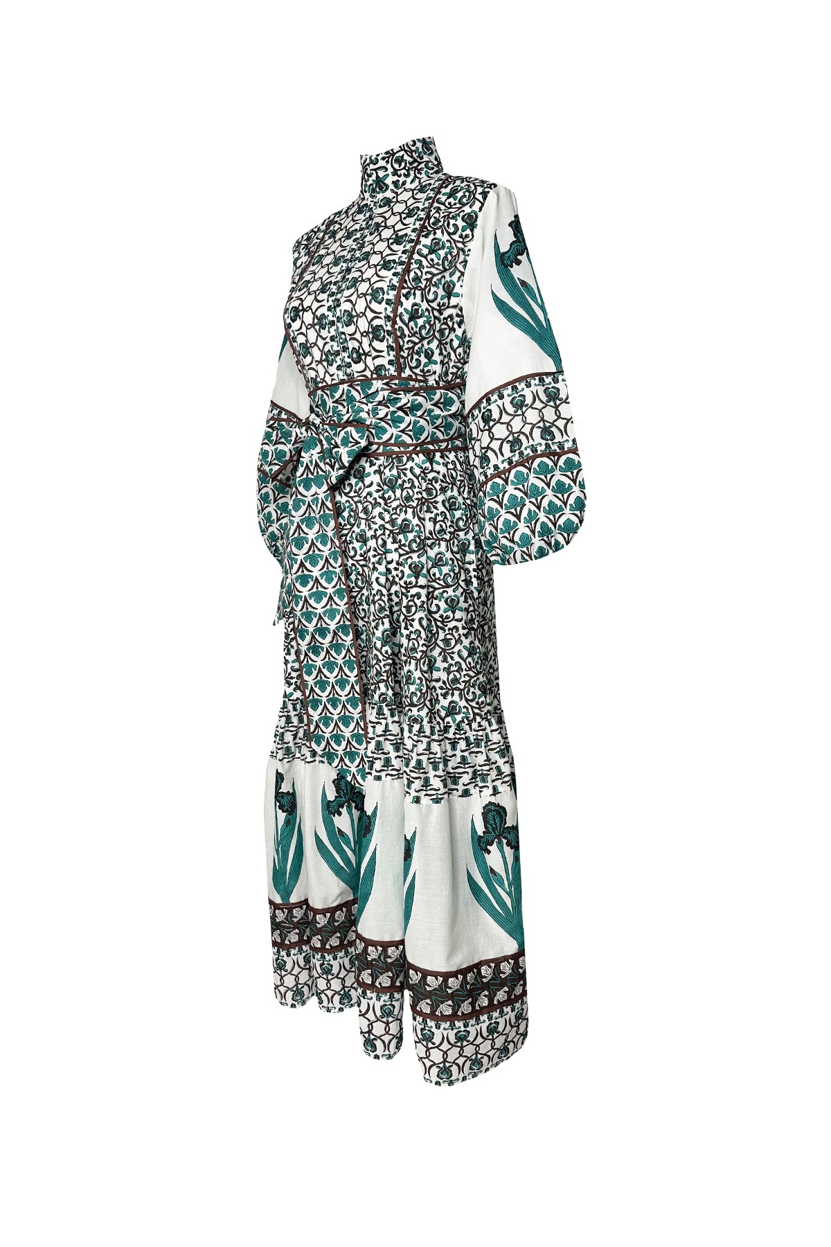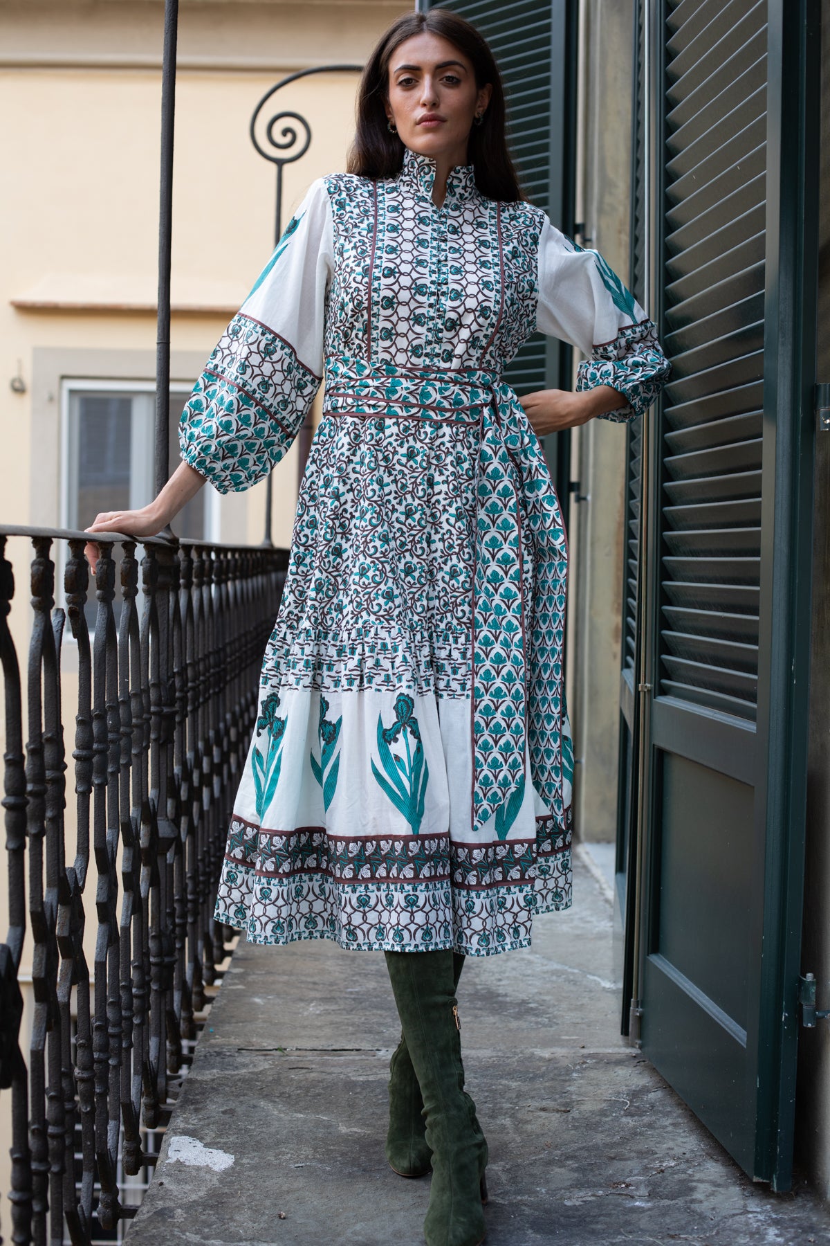 Our verdigris and espresso Iris © 2025 Print echoes the rich green patinas of Florence and the deep browns of autumn, evoking the timeless nostalgia. In Florence, the iris symbolizes wisdom and hope - its graceful bloom are a lasting emblem of the city’s enduring beauty. A classic pairing of hand-drawn florals on our signature SUE SARTOR Flounce™ dress make for the perfect staple for any occasion this fall. This garment has all the classic details: 100% cotton, pockets, button front placket, contrast piping, tiered skirt, and a face-framing collar. Pair it back with a fun boot and our Navy Trellis Heritage Knitwear Collection for the autumn months ahead.